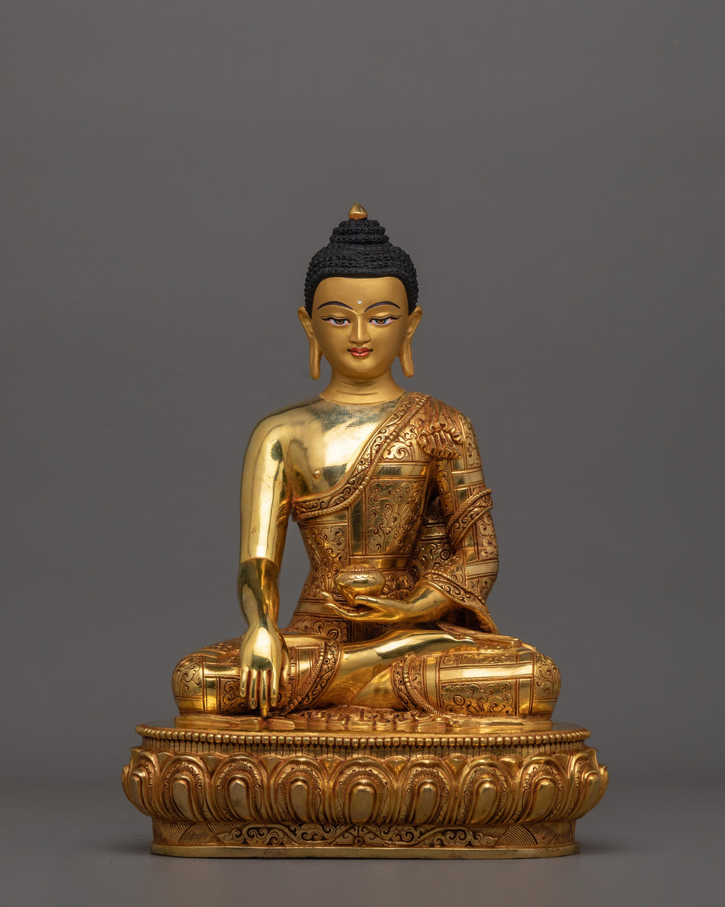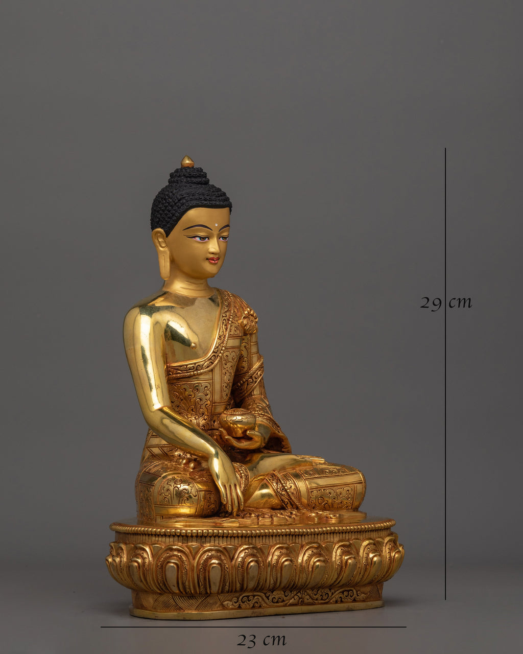 Shakyamuni Buddha is depicted sitting in the lotus pose (padmasana), indicating his steady concentration and mastery over the distractions of the material world. His right hand stretched toward the earth in bhumisparsha mudra, represents his moment of enlightenment, inviting the earth to witness his waking. The left hand, lying gently in his lap in dhyana mudra holding an alms bowl depicts the profound state of meditation and mindfulness that leads to insight and clarity.