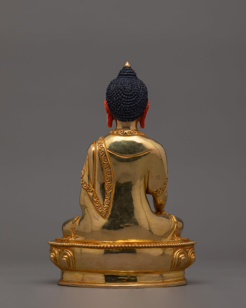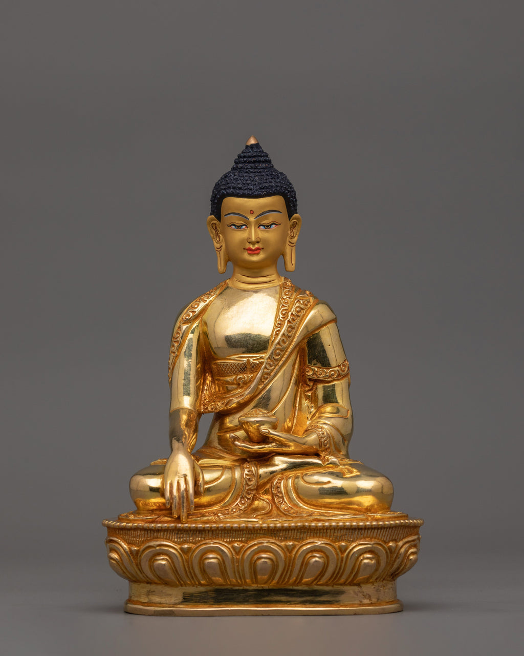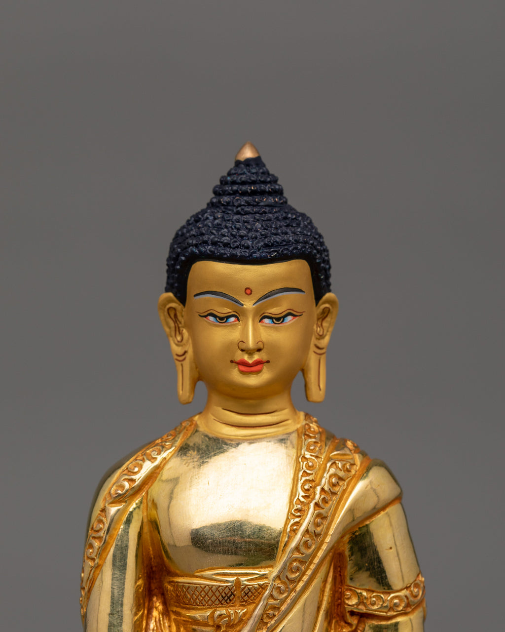 The Enlightened Guru Shakyamuni Buddha Statue symbolizes the Buddha's deep teachings and the path to spiritual awakening. This handcrafted statue is 6.1" (Height) x 3.9" (Base) and weighs 0.762 kg. It is made of copper, decorated with 24K gold gilding, and enhanced with gold and acrylic paints. This sacred statue, created by expert Nepalese artisans, represents the craftsmanship of Himalayan Buddhism, making it an inspirational addition to altars, meditation places, or sacred collections.