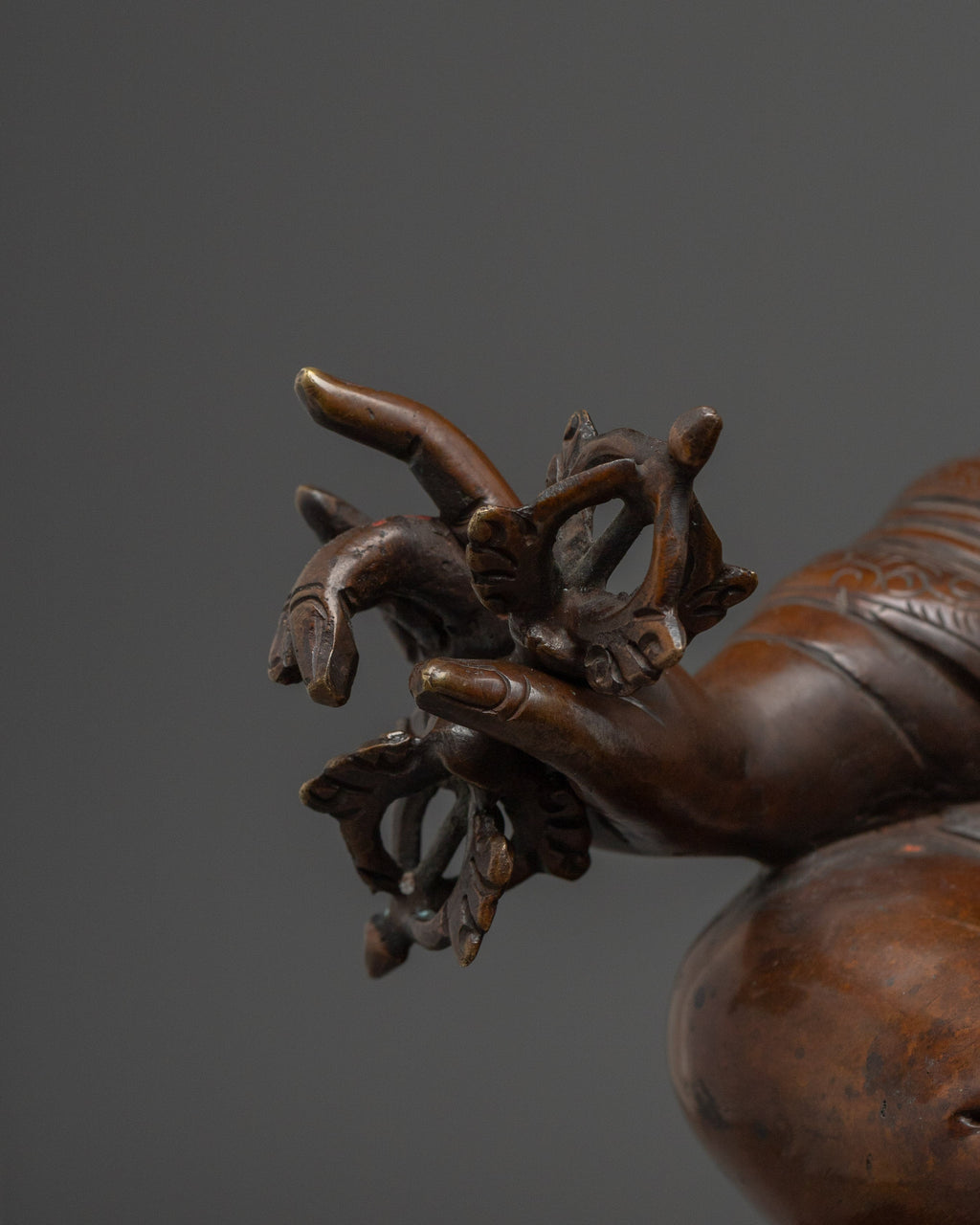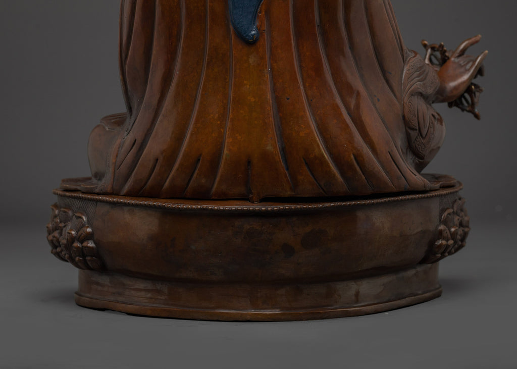 Enlightened Master Guru Rinpoche Statue stands 19.7” (50 cm) tall with a base of 12.2” (31 cm) and weighs 8.37 kg. Crafted from an oxidized copper body, it is adorned with detailed gold and acrylic paintings that bring out the rich spiritual essence of this revered tantric master. Guru Rinpoche, also known as Padmasambhava, is a central figure in Tibetan Buddhism, symbolizing wisdom and compassion, making this statue a profound addition to any sacred space or meditation altar.