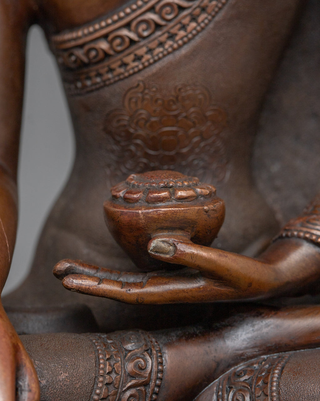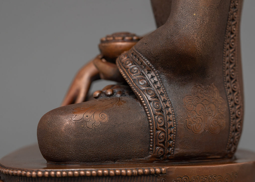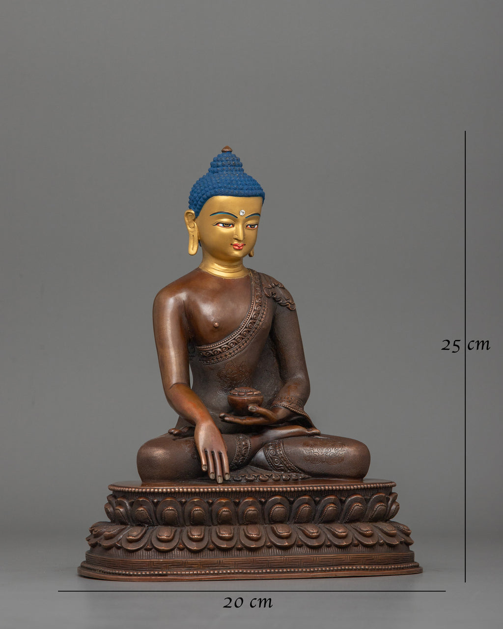 Enlightened Prince Siddhartha Gautama statue stands 9.8 inches tall, this oxidized copper statue has beautiful gold and acrylic detailing that creates a tranquil and uplifting presence. We have been sculpting Buddhist sacred deities for generations and adhere to Buddhist iconography when creating them. Gautama Buddha is depicted at the moment of his enlightenment with a calm and peaceful expression, he is seated on the moon disc of a lotus seat. His right hand is in the earth-touching mudra, and his left hand is holding an alms bowl. We gave the statue a pleasantly smooth finish to make it look luminous, and we painted his hair blue with acrylic paint.