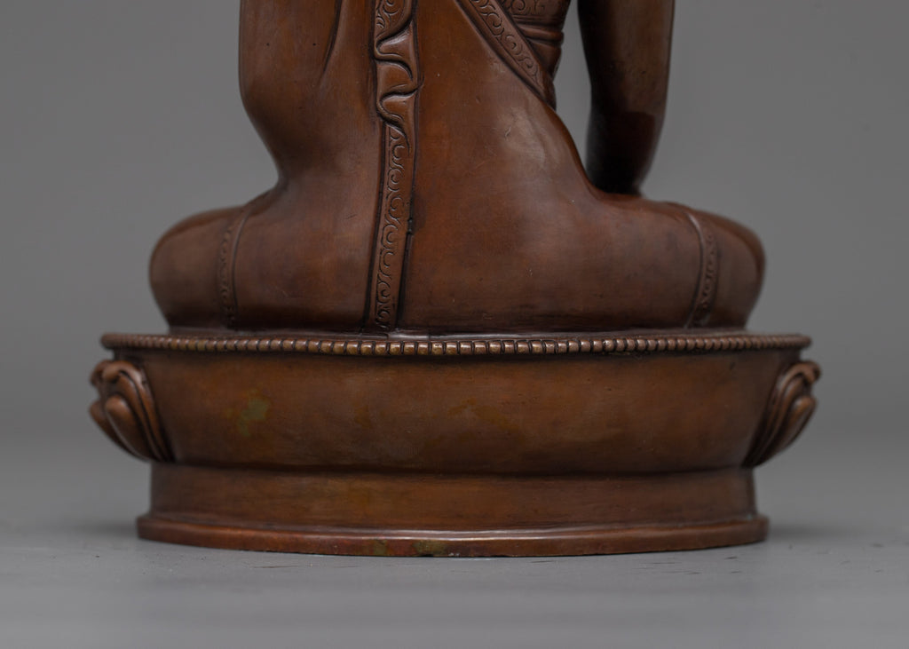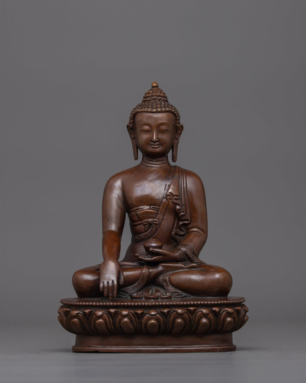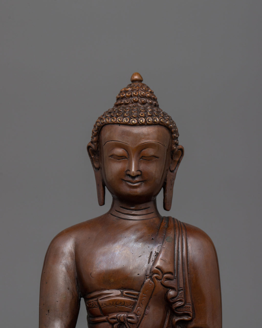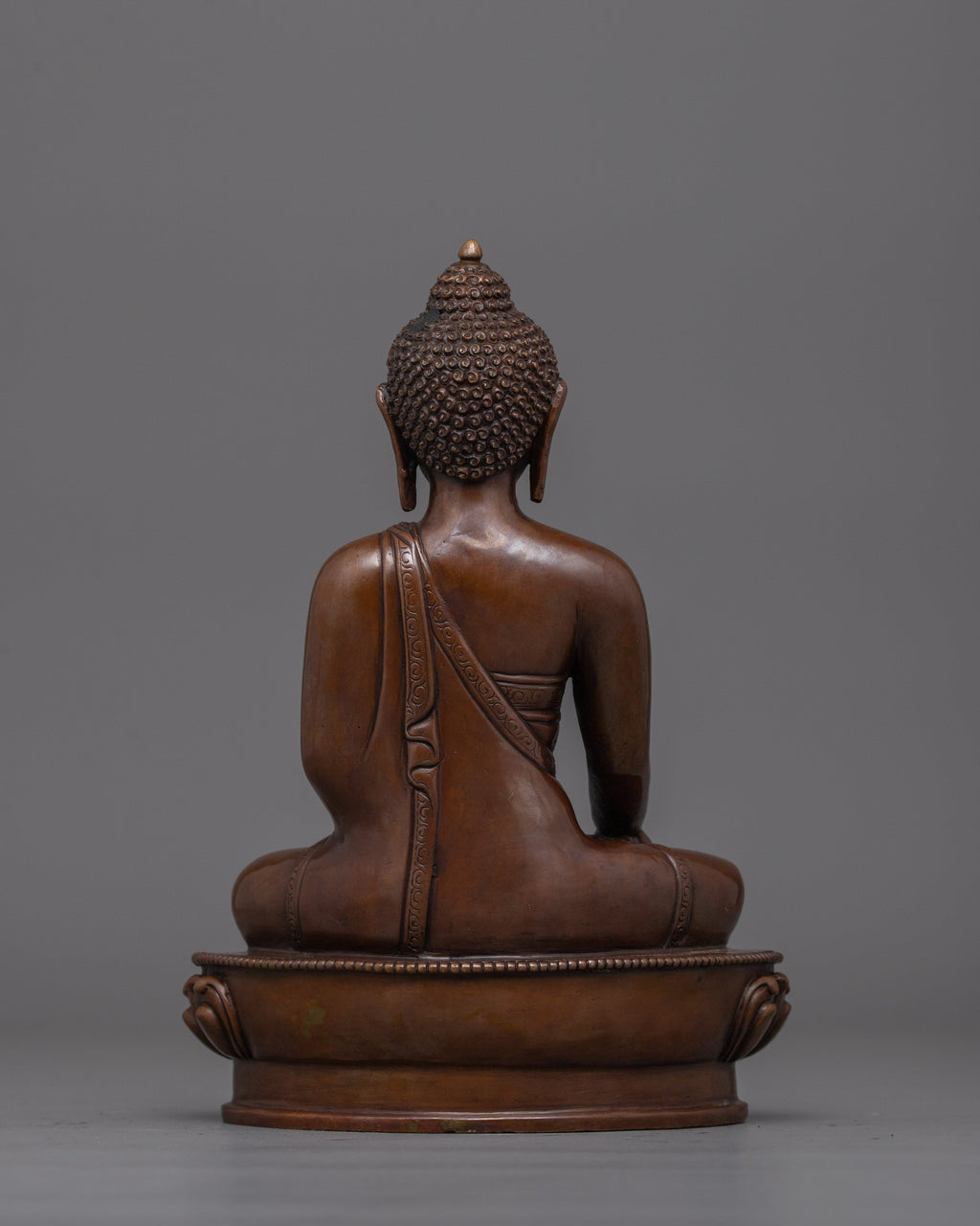 This Shakyamuni Buddha statue for Buddhist decor stands 8.3 inches tall, with a base width of 5.9 inches, and weighs 1.19 kg. Made of oxidized copper, it captures the tranquil and compassionate presence of Shakyamuni Buddha, the historical figure who attained enlightenment under the Bodhi tree and shared his teachings with the world. The Shakyamuni Buddha is not only visually appealing but also an actual reminder of the path to peace and enlightenment.