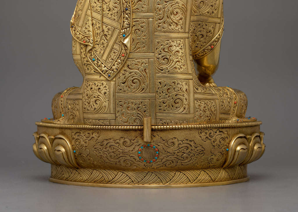 The Enlightened Teacher Shakyamuni Buddha Sculpture, symbolizes the Buddha's deep teachings and the path to spiritual awakening. This handcrafted statue is Enlightened Teacher Shakyamuni Buddha Sculpture 19.9" (Height) x 12.2" (Base) and weighs 9.05 kg. It is made of copper covered with triple layer 24K gold gilding and carved with deeply engraved carvings that produce a magnificent 3D-like effect. This sculpture, adorned with hand-carved gemstones, represents the spiritual creativity of Himalayan Buddhism, making it a powerful addition to altars, meditation places, or sacred collections.