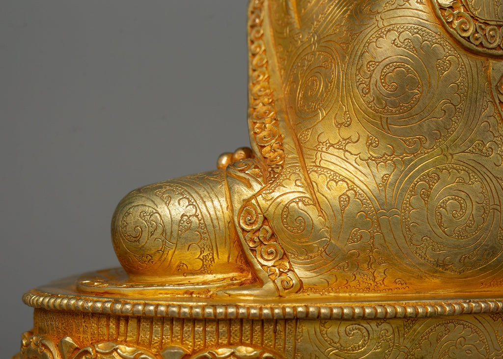 The statue depicts Vairocana with his hands form the Dharmachakra mudra, which represents the spinning of the Wheel of Dharma and the spread of universal truth. Sitting on a lotus seat, his position represents the purity and transcendence of his wisdom. The three faces are a powerful symbol of the Trinity of Enlightenment, representing the unification of body, speech, and thought, and expressing Vairocana's mastery over spiritual realms.