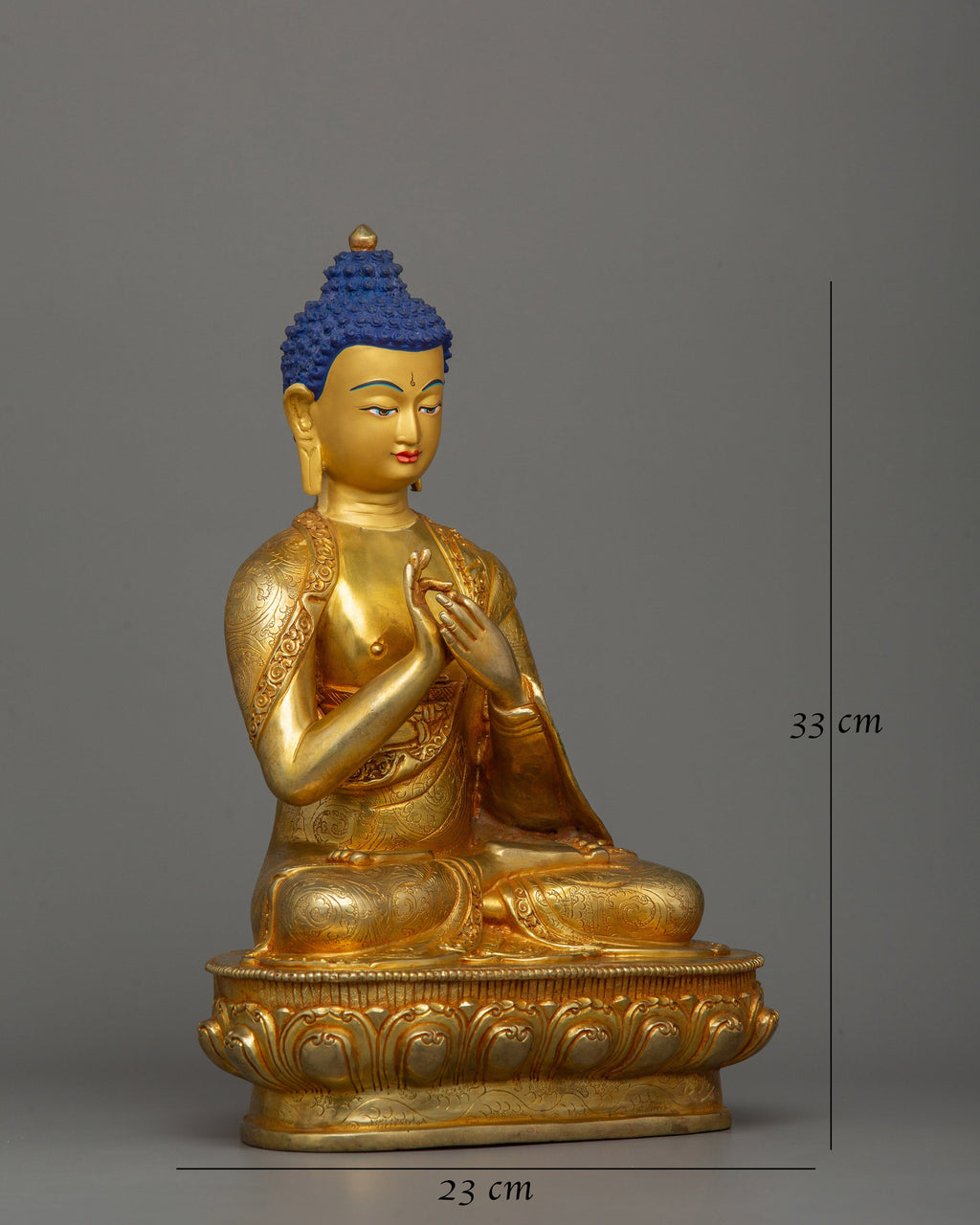 The Enlightened Vairocana Cosmic Buddha Statue is representing universal wisdom and enlightenment in Mahayana and Vajrayana Buddhism. This statue stands at an impressive 13 inches (33cm) in height with a base width of 9.1 inches (23cm), making it a prominent and striking centerpiece for any sacred space or collection. It is hand-crafted with 24K gold gilded finish, complemented by intricate gold and acrylic paintings. This sacred statue, created by expert Nepalese artisans, represents the craftsmanship of Himalayan Buddhism, making it an inspirational addition to altars, meditation places, or sacred collections.
