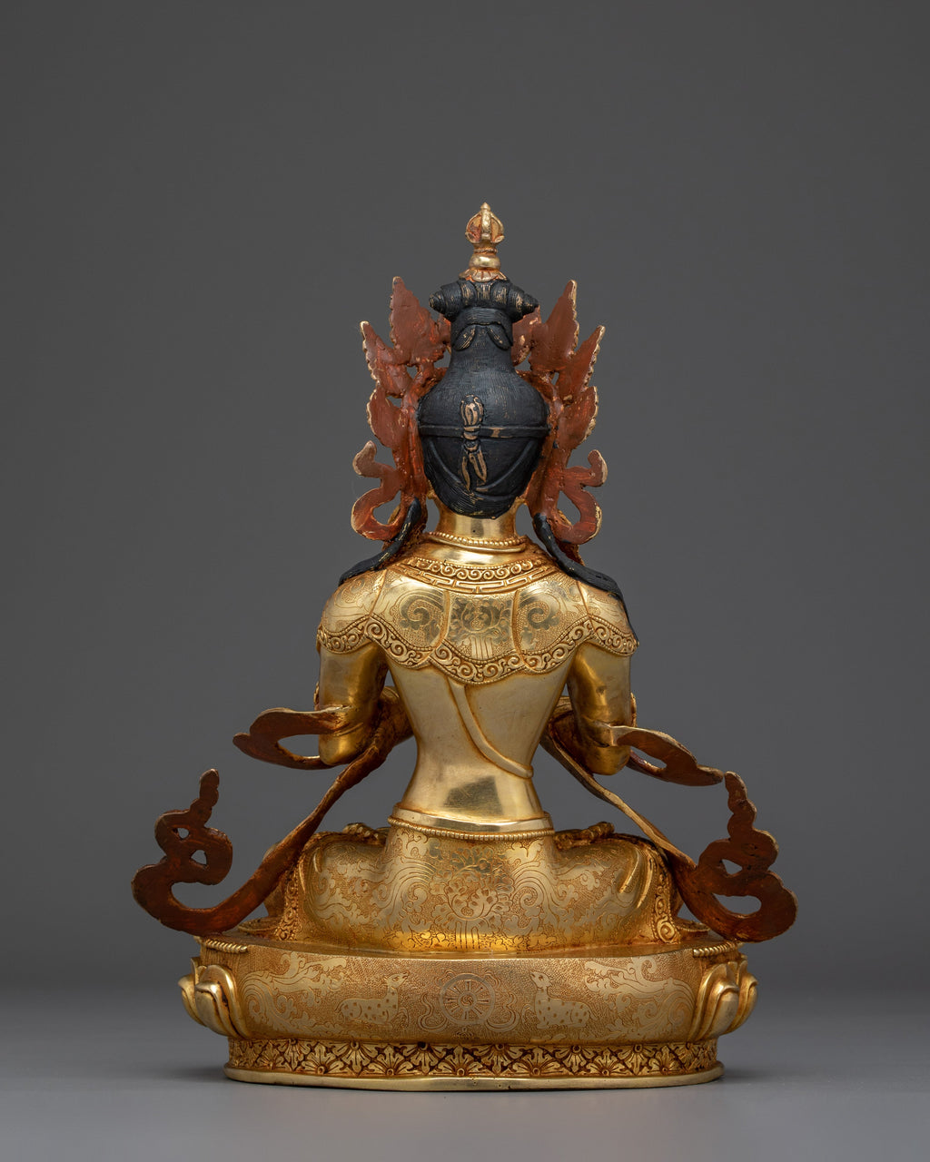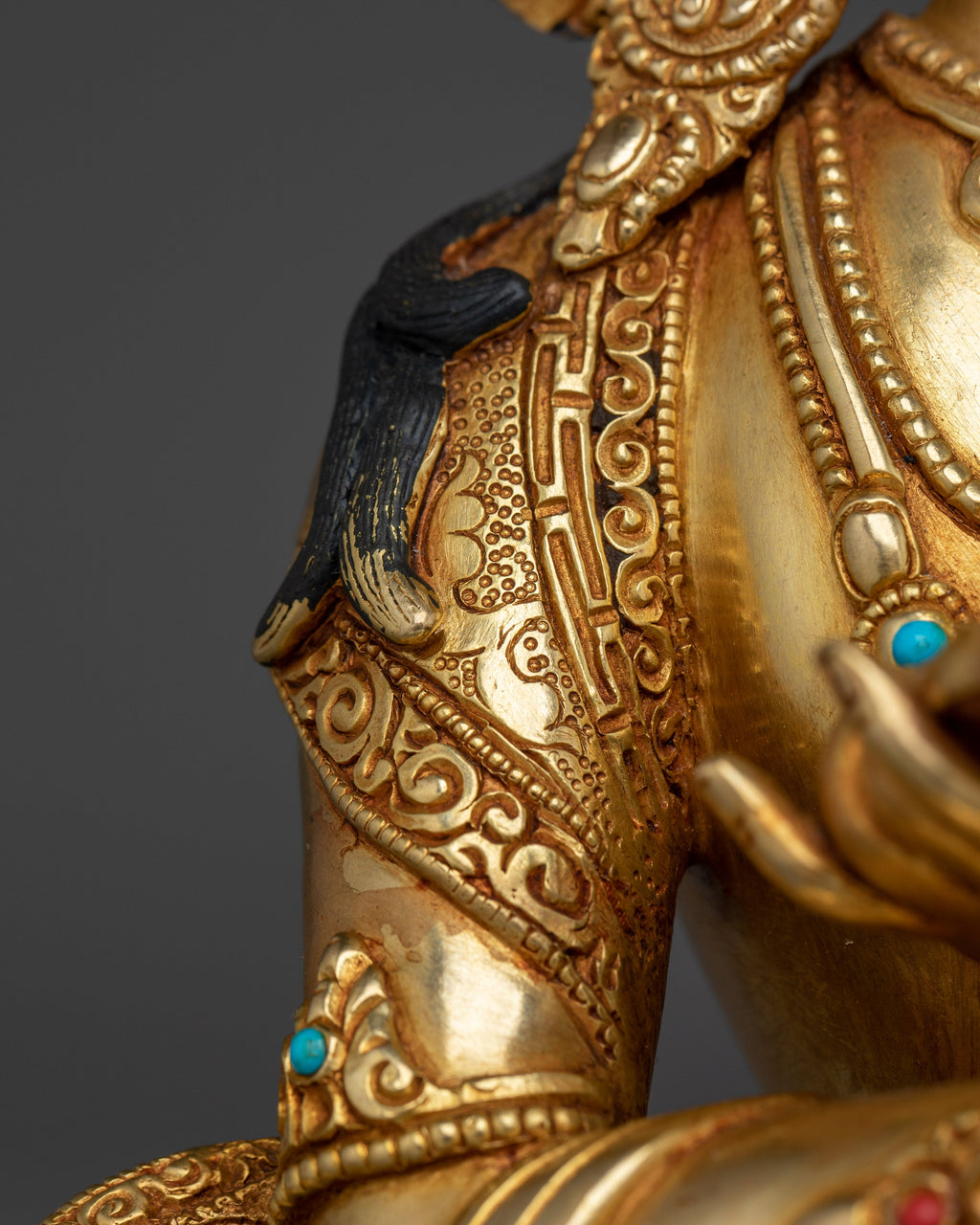 Enlightenment Symbol Vajradhara measures 12.2 inches (31 cm) in height with a base width of 9.8 inches (25 cm), and has a substantial weight of 2.92 kilograms, giving it a strong and grounded presence. Expertly crafted from a copper body, the figure is adorned with 24K gold gilding that enhances its divine brilliance and sacred symbolism. The surface is further enriched with intricate gold and acrylic paintings, which bring out the delicate features and fine detailing of the statue. Embedded gemstones add a luxurious and auspicious touch, reflecting traditional Himalayan artistry and spiritual significance.