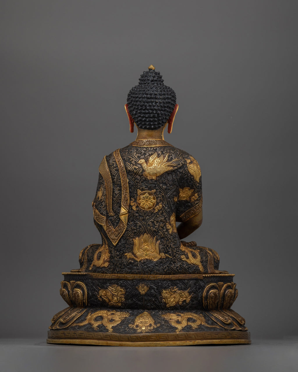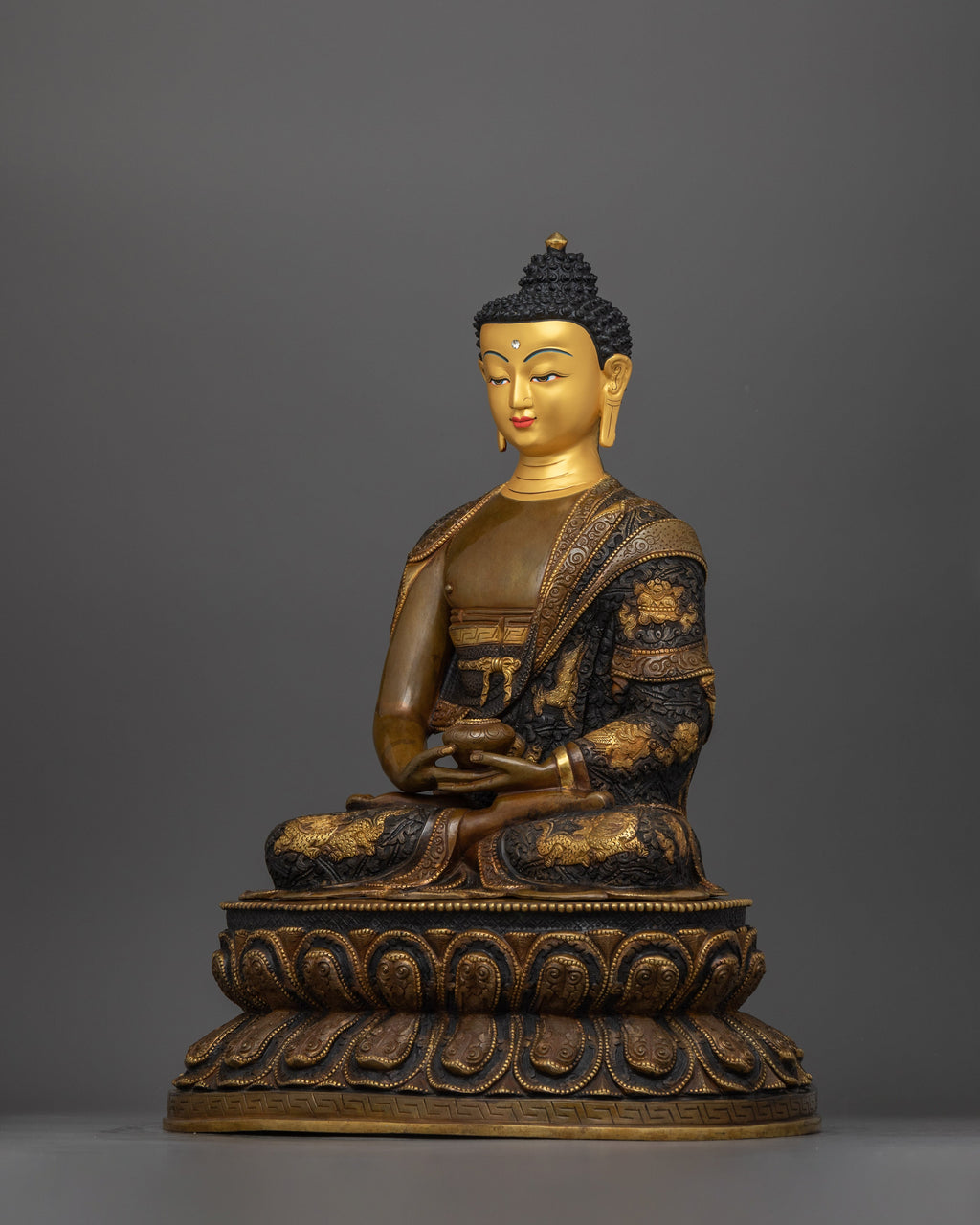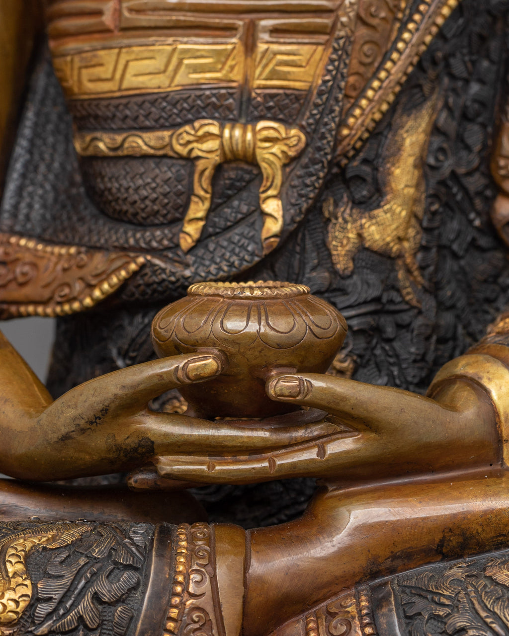 Eternal Light Buddha Amitabha is crafted from an oxidized copper body and adorned with intricate gold and acrylic paints and 24K gold gilding, this was expertly made in Patan, Nepal. The statue's ageless grace is enhanced by its aged, oxidized finish, which conveys a sense of spiritual depth and antiquity. From Amitabha's serene countenance to the elaborate designs of his garments, every element showcases the commitment and skill of Nepalese craftspeople.