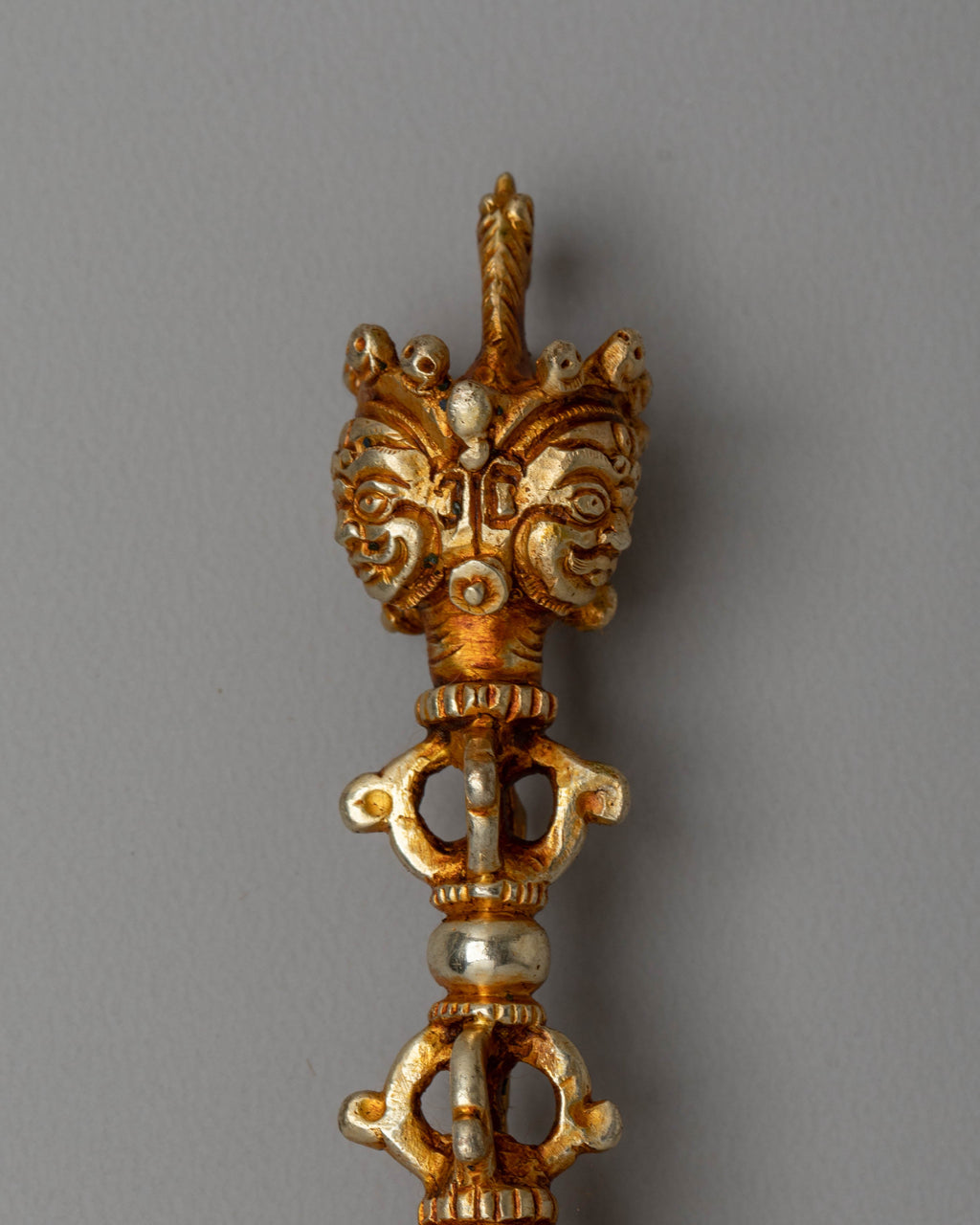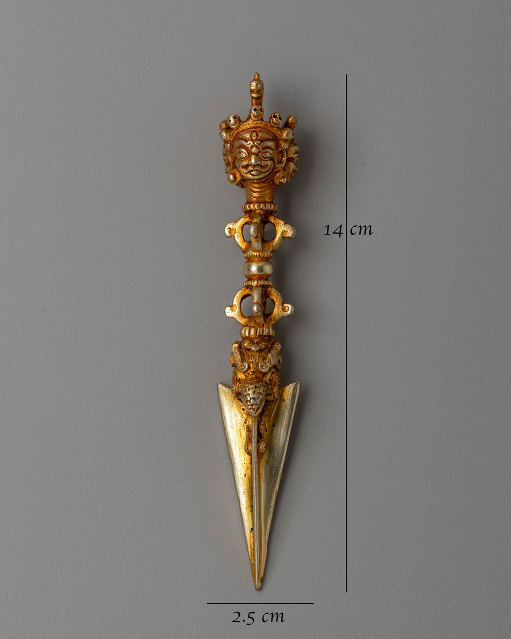 This handcrafted Evamratna Ritual Dagger, also known as a Phurba, is designed for spiritual practitioners seeking a deeper connection with tantric ceremonies. Measuring 14cm in height and 2.5cm in width, and weighing 0.082kg, it serves as a potent spiritual tool for rituals and meditation. Crafted from copper and water gold, this sacred dagger embodies the transformative power of Tibetan rituals, helping to purify negative energy and foster spiritual growth.