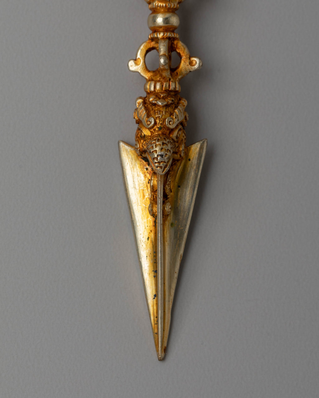 A Phurba is a ceremonial knife used in Tibetan Buddhism, particularly within the Vajrayana tradition. It is recognized by its distinctive three-sided blade, which symbolizes the eradication of ignorance, desire, and aversion—the three primary causes of suffering in Buddhist philosophy. The Phurba is often utilized in rituals to cut through obstacles, dispel negative energies, and protect against harmful influences. Its ritualistic role also extends to the removal of inner demons and hindrances to spiritual development. The Phurba’s symbolic significance emphasizes the integration of wisdom, compassion, and skillful means on the path to enlightenment.