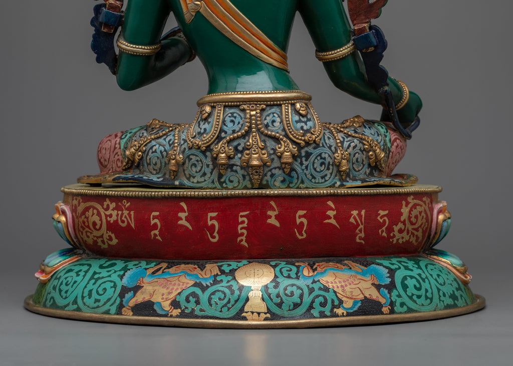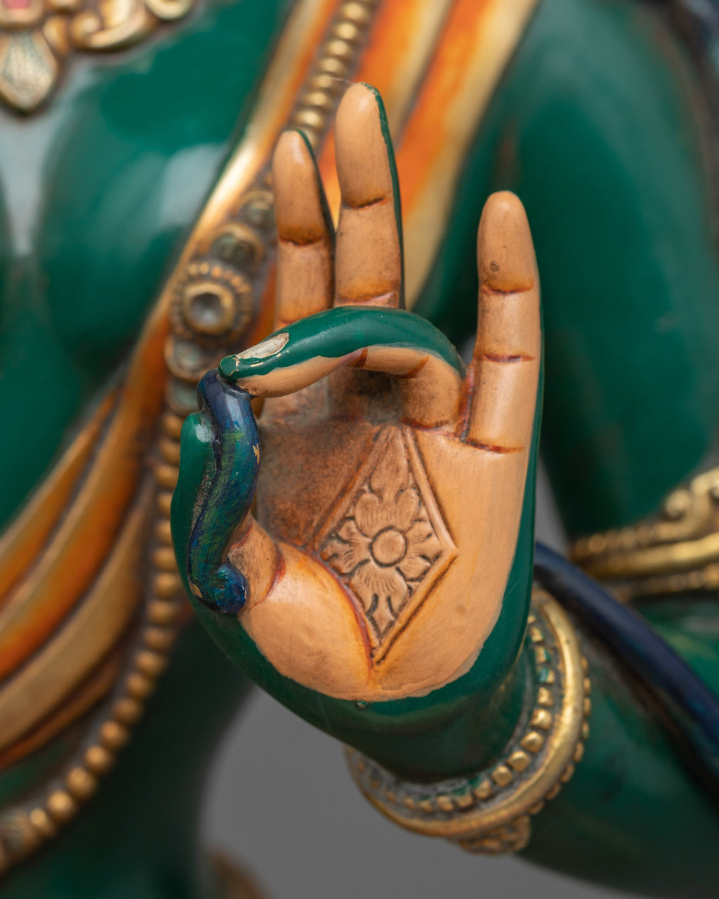 This statue, weighing 10.78 kg, is both stable and durable, making it a long-lasting piece of decor. The statue's rich workmanship and symbolism embody the essence of Green Tara, the Tibetan Buddhist goddess of compassion and protection. This statue is not just a piece of decor but a symbol of compassion, serenity, and enlightenment.