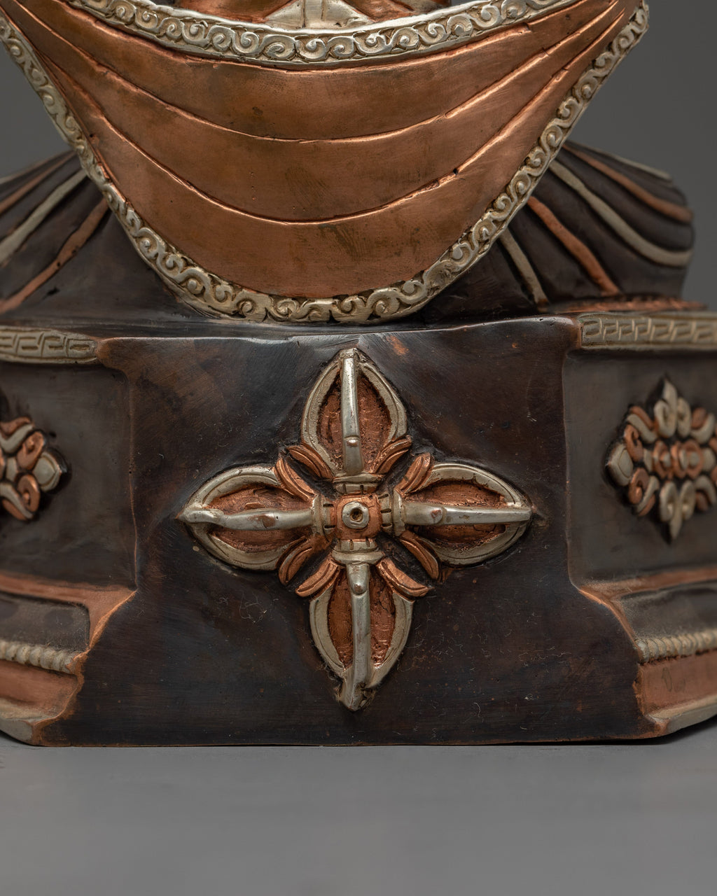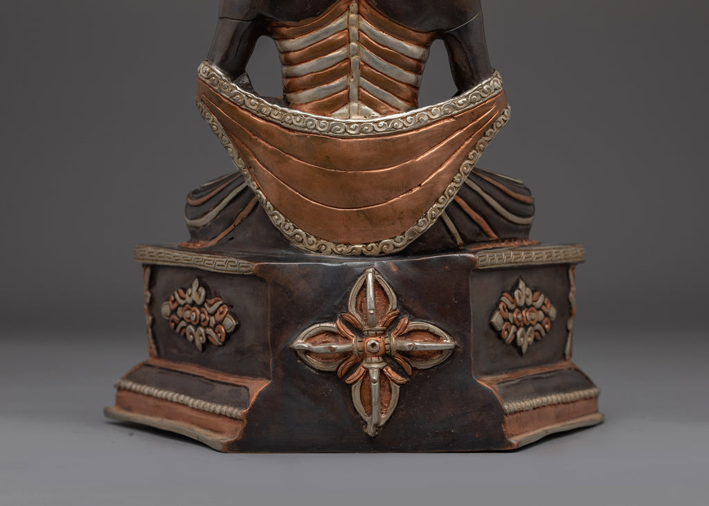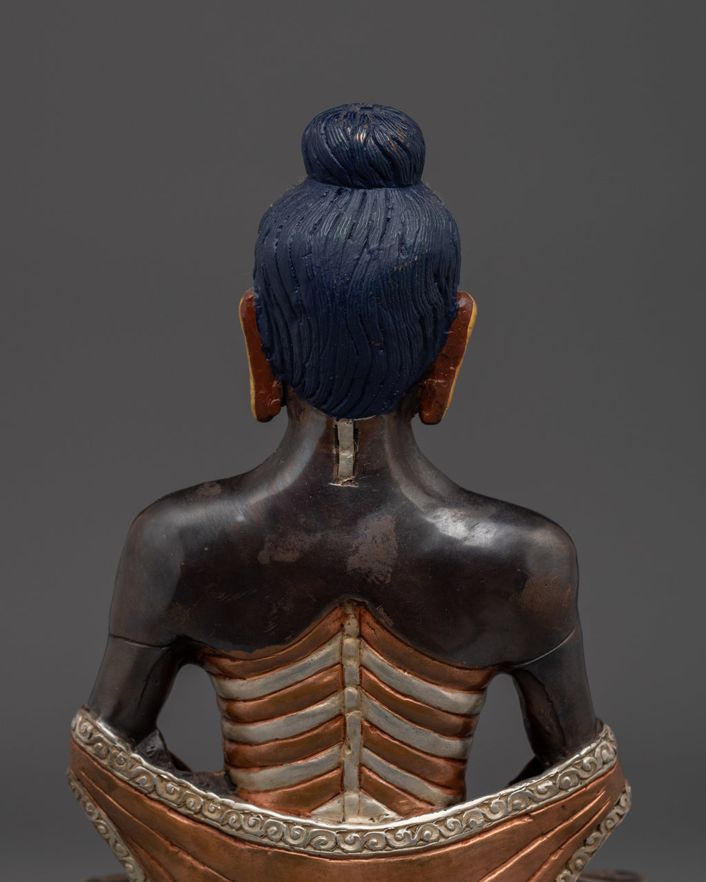 This Fasting Buddha Statue measures 10.4 inches (26.5 cm) in height and 7.9 inches (20 cm) at the base, with a weight of 2.41 kg. Handcrafted from copper, silver plated, and adorned with gold and acrylic paintings, it reflects the skilled artistry of traditional Nepali craftsmen.