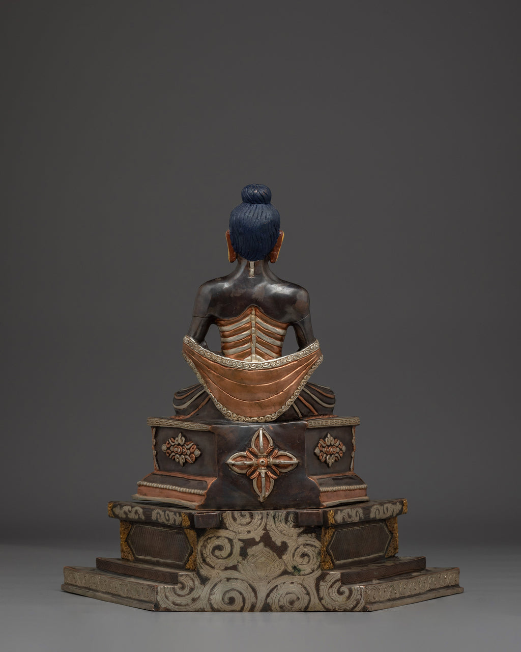 The Fasting Buddha is depicted as emaciated, with exaggeratedly visible ribs, sunken cheeks, hollow eyes, and pronounced veins and tendons. The skeletal form powerfully conveys the physical toll of extreme asceticism and self-mortification that Siddhartha Gautama (Shakyamuni Buddha) underwent before attaining enlightenment. The Buddha is often shown seated in a meditative posture (dhyanasana), with his hands resting in his lap, symbolizing deep meditation and unwavering focus on his spiritual quest.