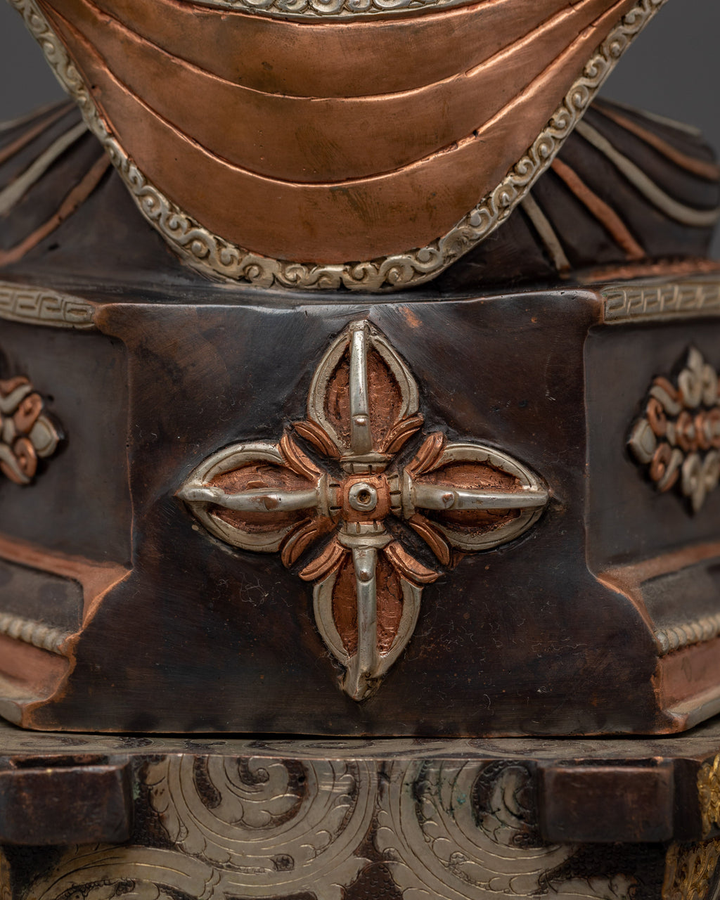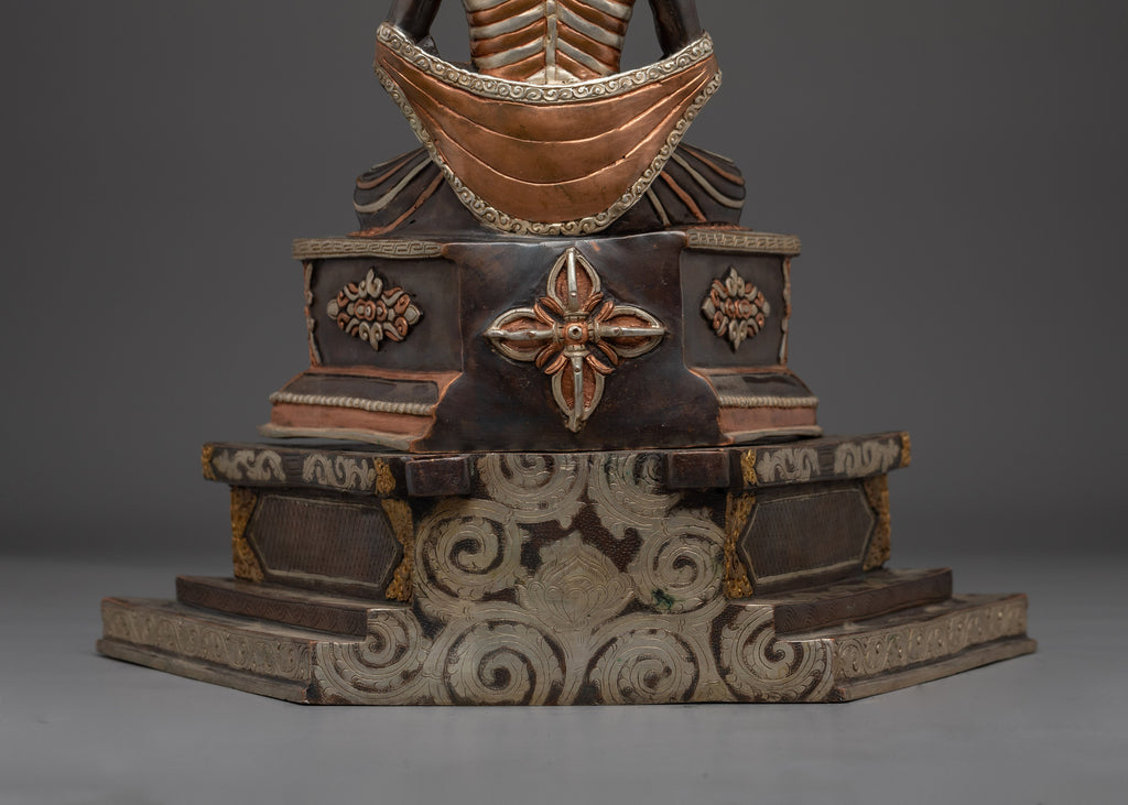 Fasting Buddha with a throne stands 15.9” (40.5 cm) tall with a base width of 13.6” (34.5 cm) and weighs 5.78 kg. Crafted from oxidized copper and intricate gold and acrylic paintings, it captures the deeply symbolic image of Siddhartha Gautama during his period of extreme asceticism. This powerful representation reflects self-discipline, renunciation, and the profound search for enlightenment. Ideal for spiritual spaces or collectors of rare Buddhist art, it serves as a striking reminder of the Buddha’s unwavering path to awakening.