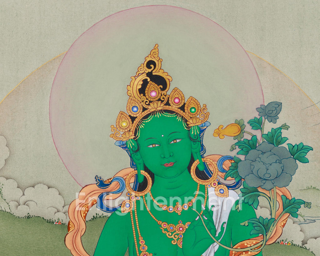 Female Bodhisattva Green Tara Painting | Goddess of Swift Action and Boundless Compassion | Surrounded by Offering Deities and Divine Lotus