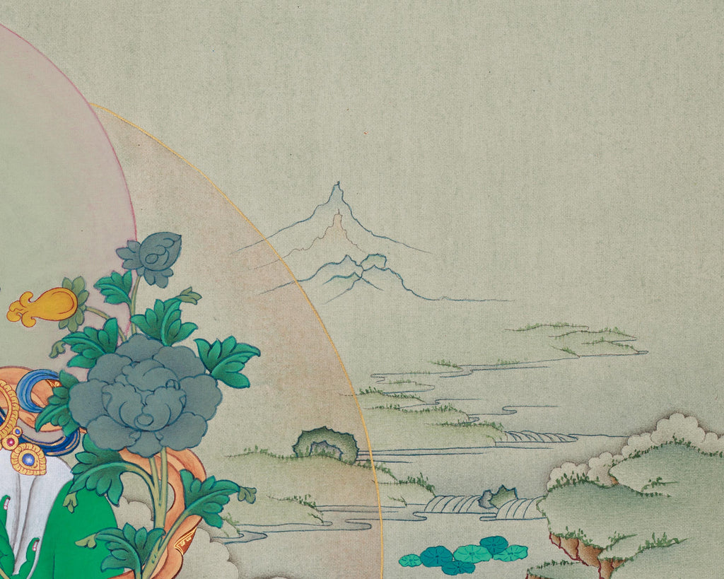 Green Tara, a symbol of compassion active in the world, is one of the most cherished bodhisattvas in Tibetan Buddhism. Often called the "Mother of all Buddhas," she protects all beings and offers quick aid and blessings. In this thangka, she appears in her bright green form, seated on a blooming lotus, a symbol of purity and spiritual development. Her calm face embodies endless compassion, while her poised stance shows her readiness to defend those in need. She holds a lotus in her right hand, symbolizing enlightenment, and extends her left hand in a blessing gesture. Clouds and lush plants surround her, enhancing her peaceful yet powerful presence. This thangka vividly captures Green Tara’s boundless love and grace.