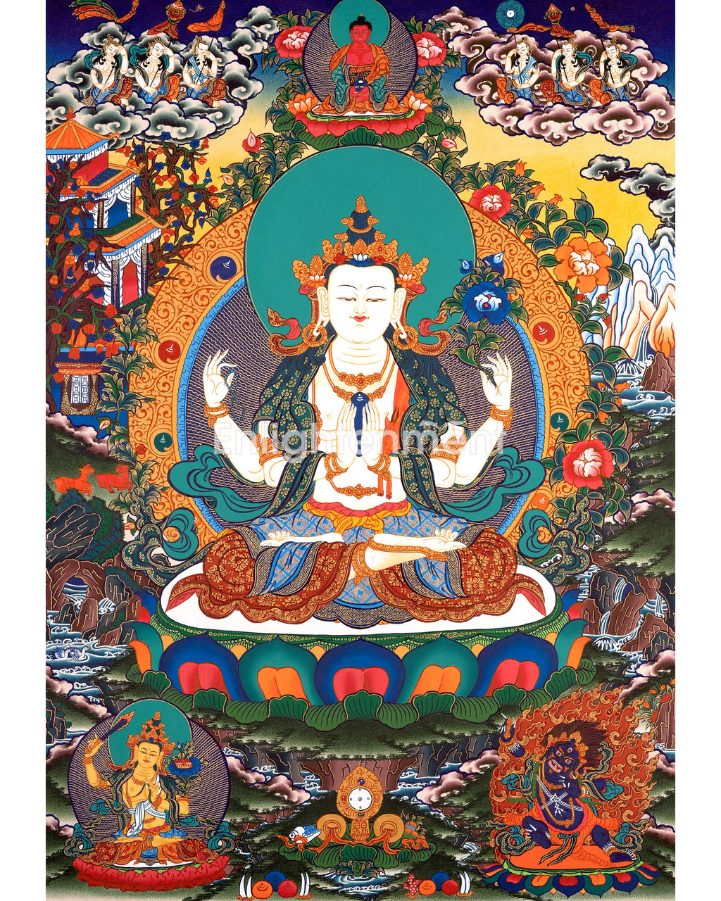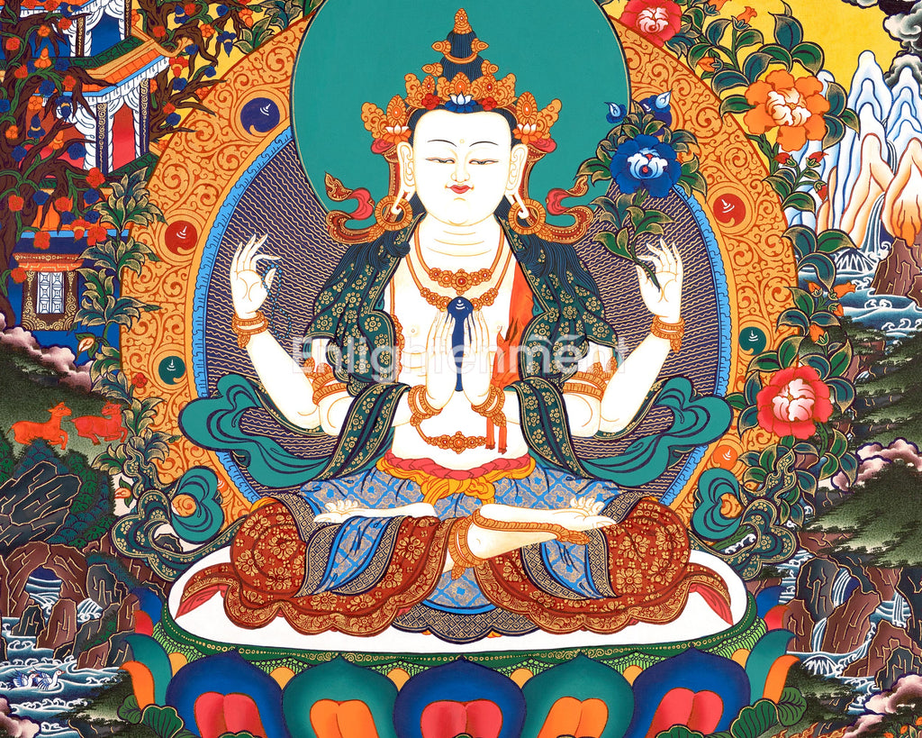 Invite the profound healing energy of White Tara and the infinite compassion of Chenrezig into your home—bring this exquisite artwork into your space today.