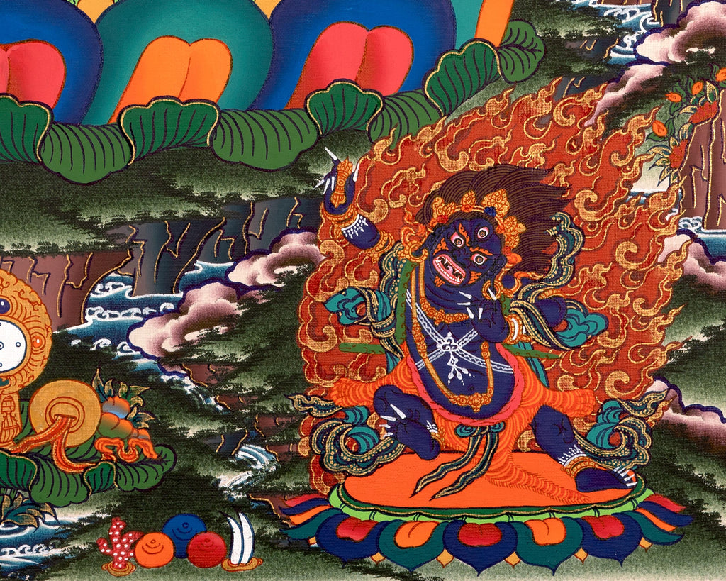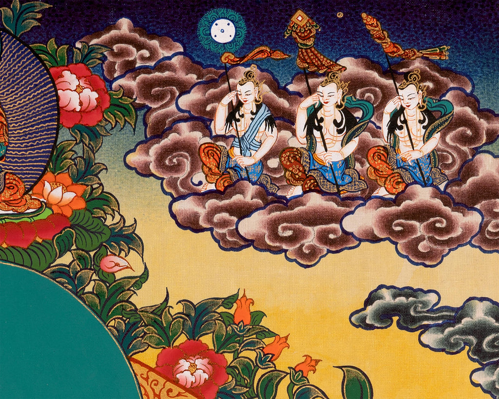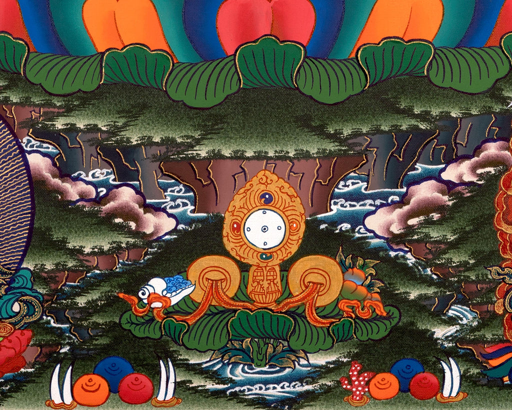 Chenrezig, the embodiment of compassion, is also beautifully portrayed, his peaceful expression radiating boundless love and healing energy. The lush, vibrant landscape surrounding them features flowing rivers, towering mountains, and serene clouds, creating a harmonious setting that enhances the tranquil and protective aura of both deities. Their presence in this thangka imbues it with compassion, protection, and spiritual guidance, transforming it into a sanctuary of peace and mindfulness.