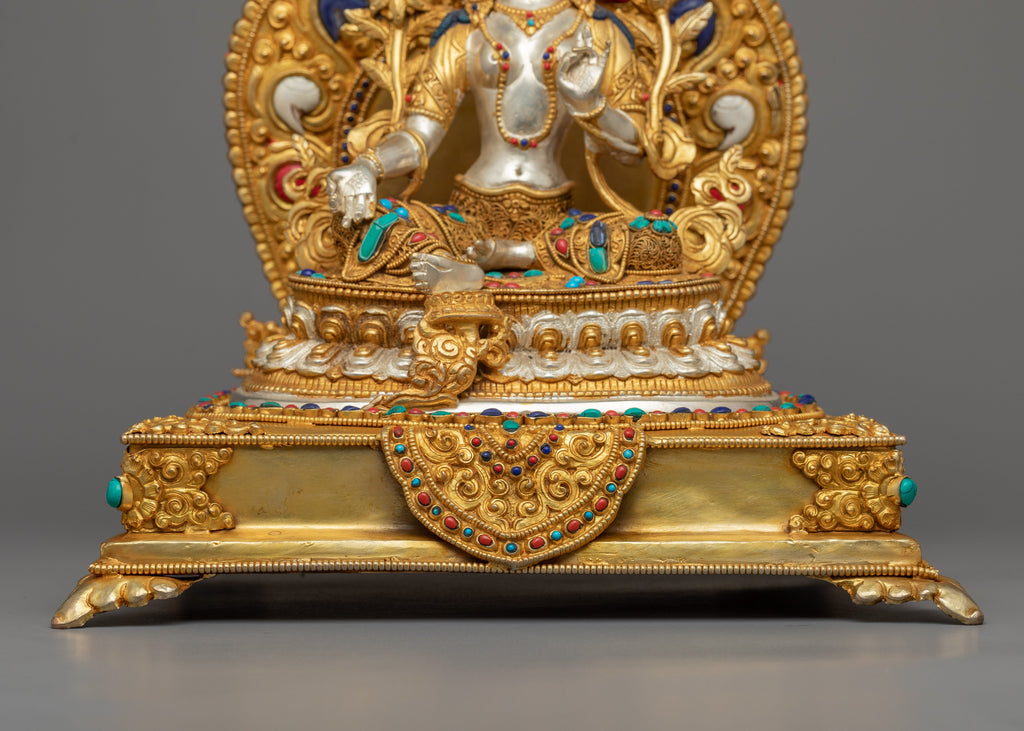Join our Green Tara Statue as you set out on a spiritual awakening adventure. This wonderfully made Female Buddha Goddess sculpture, a representation of compassion and liberation, brings the profound wisdom of Buddhism and the unmatched creativity of Nepalese craftspeople straight into your home. Can you sense the tranquil energy it radiates? Our statue is painstakingly handmade with a copper body, painstakingly gilded with 24k gold, embellished with hand-painted acrylic elements, and tastefully plated in silver. The combination of these priceless materials and deft craftsmanship turns this piece of art into an alluring representation of your spiritual journey.