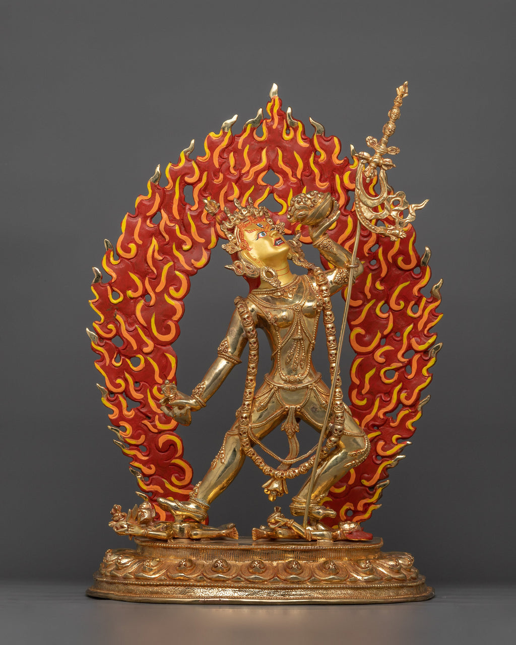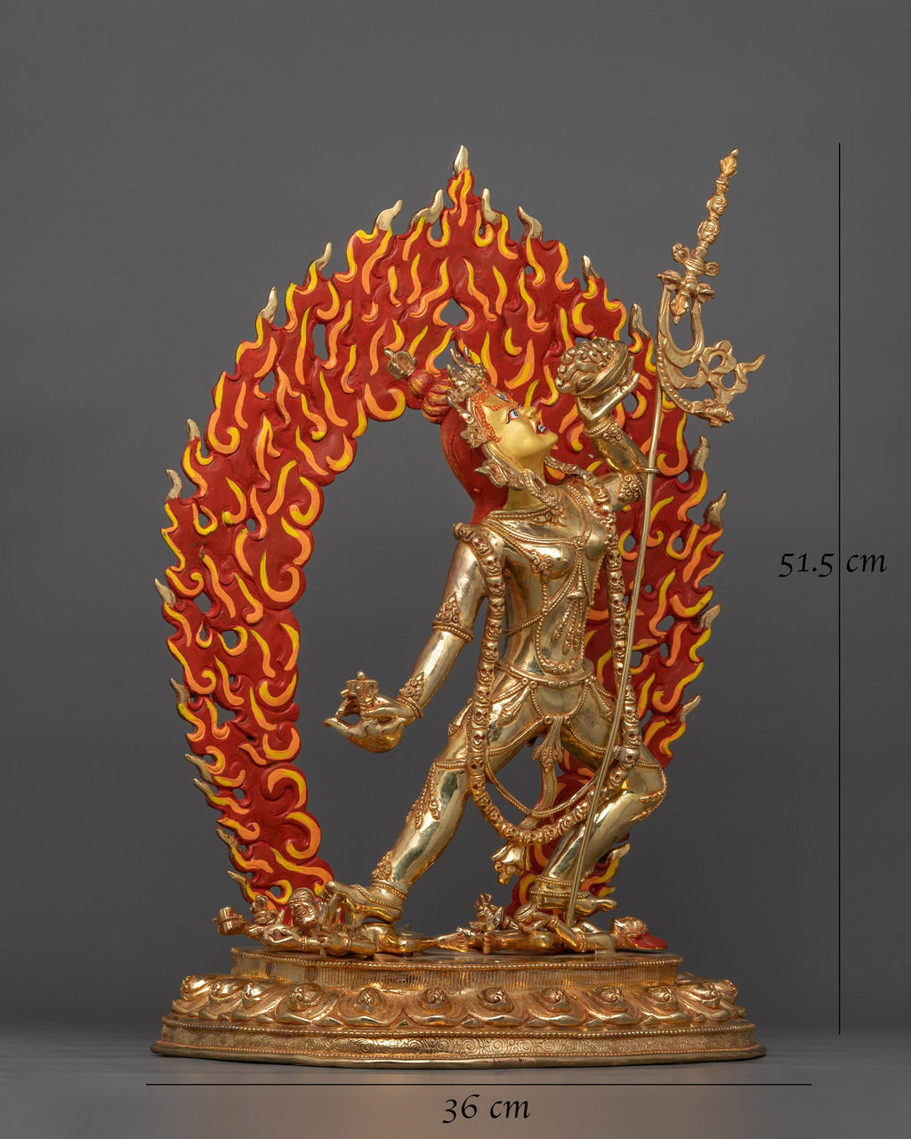 Wearing a necklace made of skulls, she represents control over death and the negative forces that negatively impact spiritual development. The Flaming Halo behind her reflects her fierce compassion and represents the destructive power of wisdom, which burns away delusions and obstacles on the path to enlightenment. Vajrayogini is regarded as the Queen of Dakinis, or feminine knowledge beings, and is known for her intense compassion, which aids practitioners in overcoming duality and realizing the essence of reality. For tantric Buddhists, this beautifully carved statue is a focal point that embodies the transformational power of Vajrayogini in any holy location.
