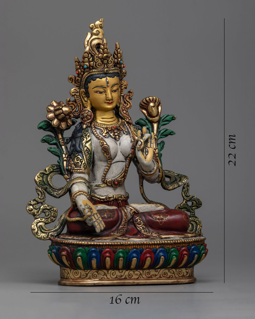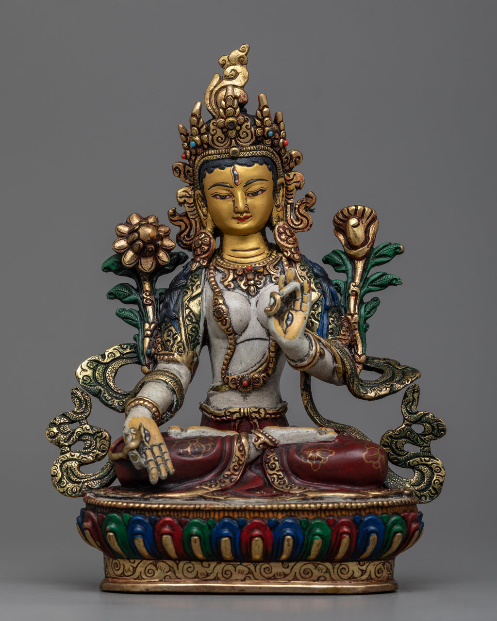 White Tara (also known as Dolma) a Female Buddha in the Buddhist tradition. White Tara appears in the form of a female bodhisattva and goddess for the benefit of every living being. According to mythology, from Avalokiteshvara's tear, which dropped to the earth and formed a lake, she was created. A lotus arose from its waters, which, when opened, showed the goddess. She, like Avalokiteshvara, is a kind, calming divinity who assists men in their quest to "cross to the other.