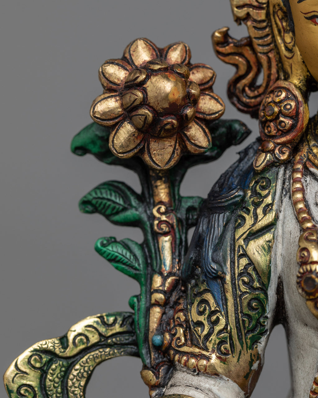 The Female Buddhist Goddess White Tara represents compassion, wisdom, and nurturing energy. Allow the divine feminine presence to awaken and inspire these traits within you as you ponder this statue. Feel a profound connection to the spiritual art and symbolism portrayed by this statue. Feel the divine feminine energy's transforming force guiding you toward self-empowerment, inner strength, and spiritual progress.