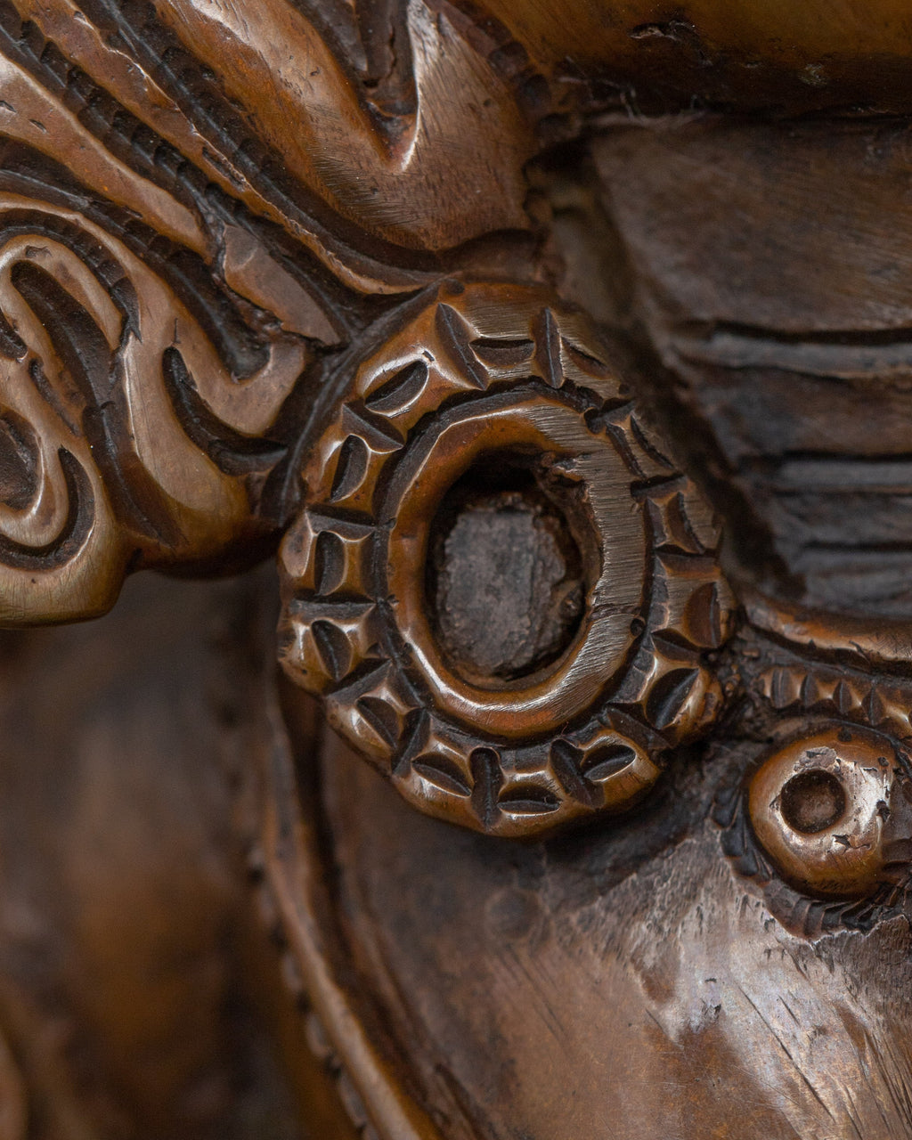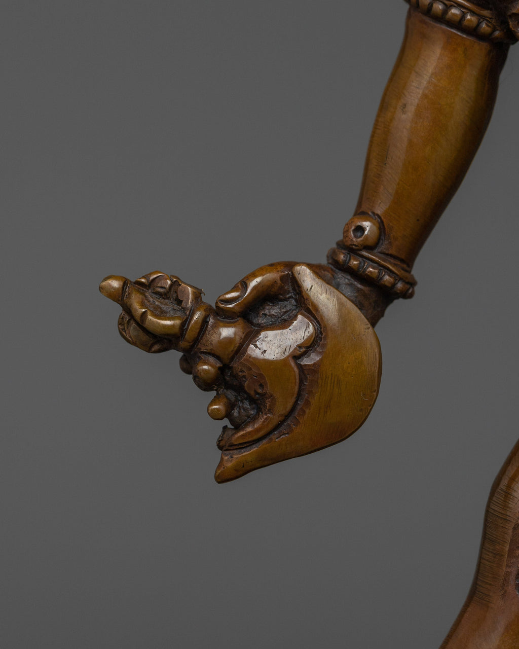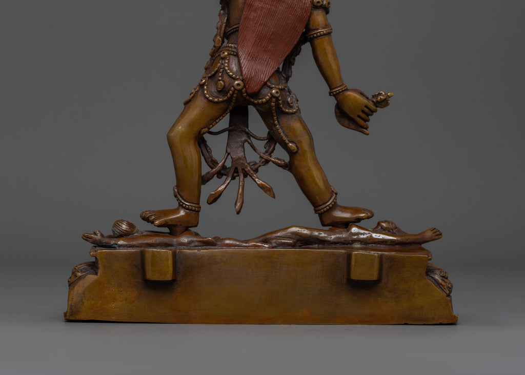 Wearing a necklace made of skulls, she represents control over death and the negative forces that negatively impact spiritual development. The Flaming Halo behind her reflects her fierce compassion and represents the destructive power of wisdom, which burns away delusions and obstacles on the path to enlightenment. Vajrayogini is regarded as the Queen of Dakinis, or feminine knowledge beings, and is known for her intense compassion, which aids practitioners in overcoming duality and realizing the essence of reality. For tantric Buddhists, this beautifully carved statue is a focal point that embodies the transformational power of Vajrayogini in any holy location.