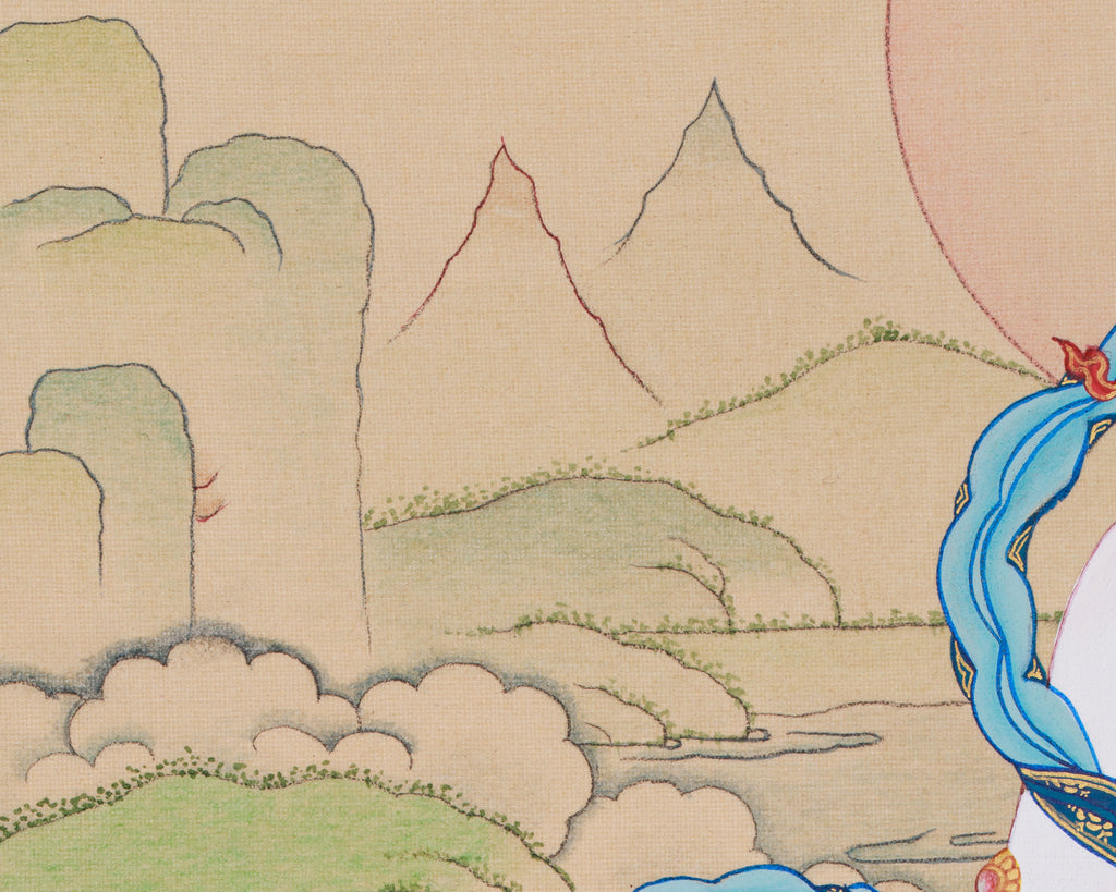 White Tara, a revered goddess of compassion and healing in Tibetan Buddhism, is shown in this beautiful thangka with a tranquil yet commanding stance, radiating calmness and strength. She sits in the meditative lotus pose, symbolizing harmony, peace, and spiritual wisdom. Her right hand is raised in the Varada mudra, signifying blessings, healing, and the easing of suffering, while her left hand holds a lotus flower, representing purity and spiritual awakening. White Tara has seven eyes—one on her forehead, two on her palms, and two on her soles—indicating her all-seeing awareness and deep compassion for all beings. Her posture and gestures highlight her role as a divine protector, healer, and guide, embodying longevity, peace, and spiritual growth in Tibetan tradition.
