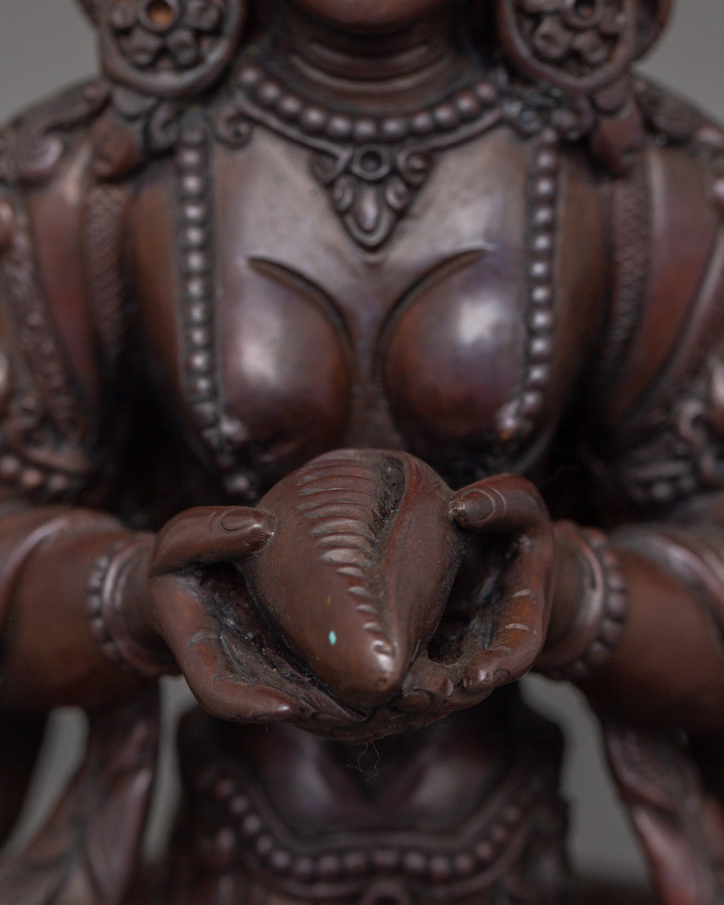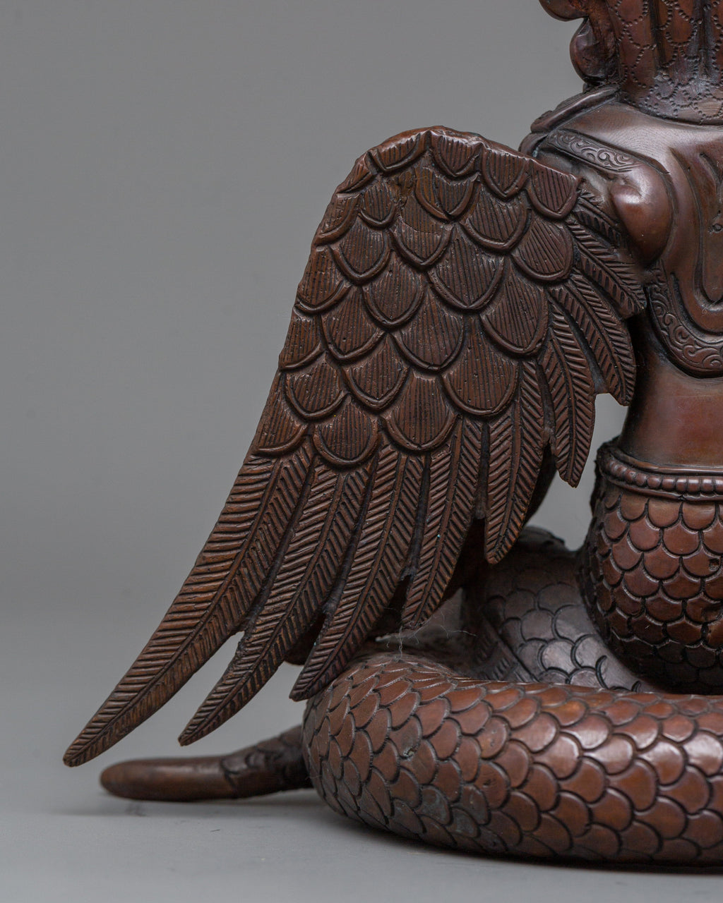 This Female Serpent Naga Kanya Statue stands 9.1” (23 cm) in height and has a base width of 7.7” (19.5 cm). Made from oxidized copper, it captures the essence of the Nagakanya, a mystical and protective serpent maiden in Buddhist mythology. The copper material has developed an antique look that enhances its charm.