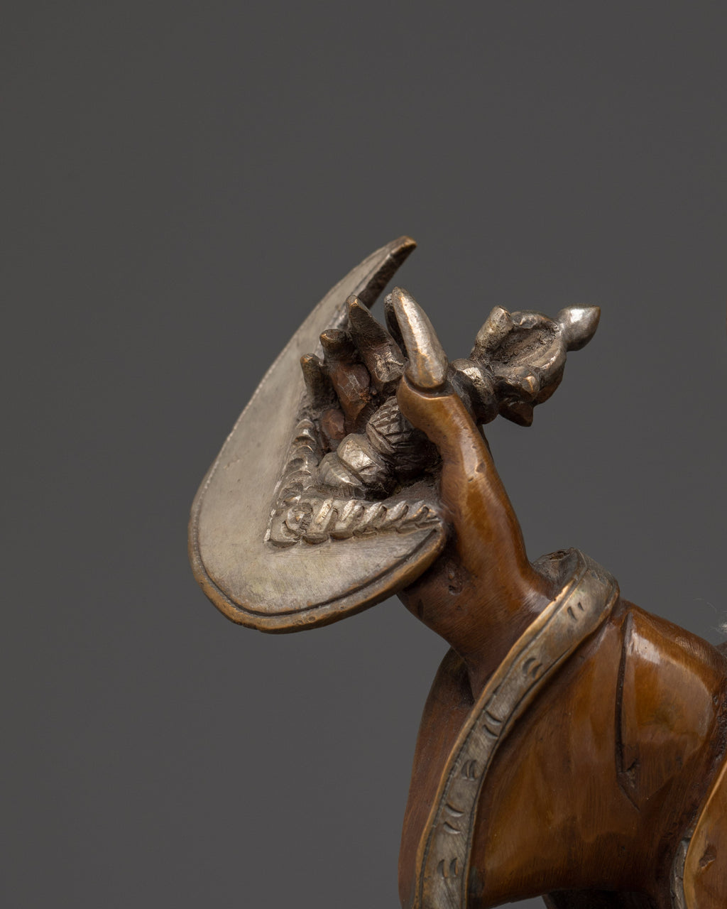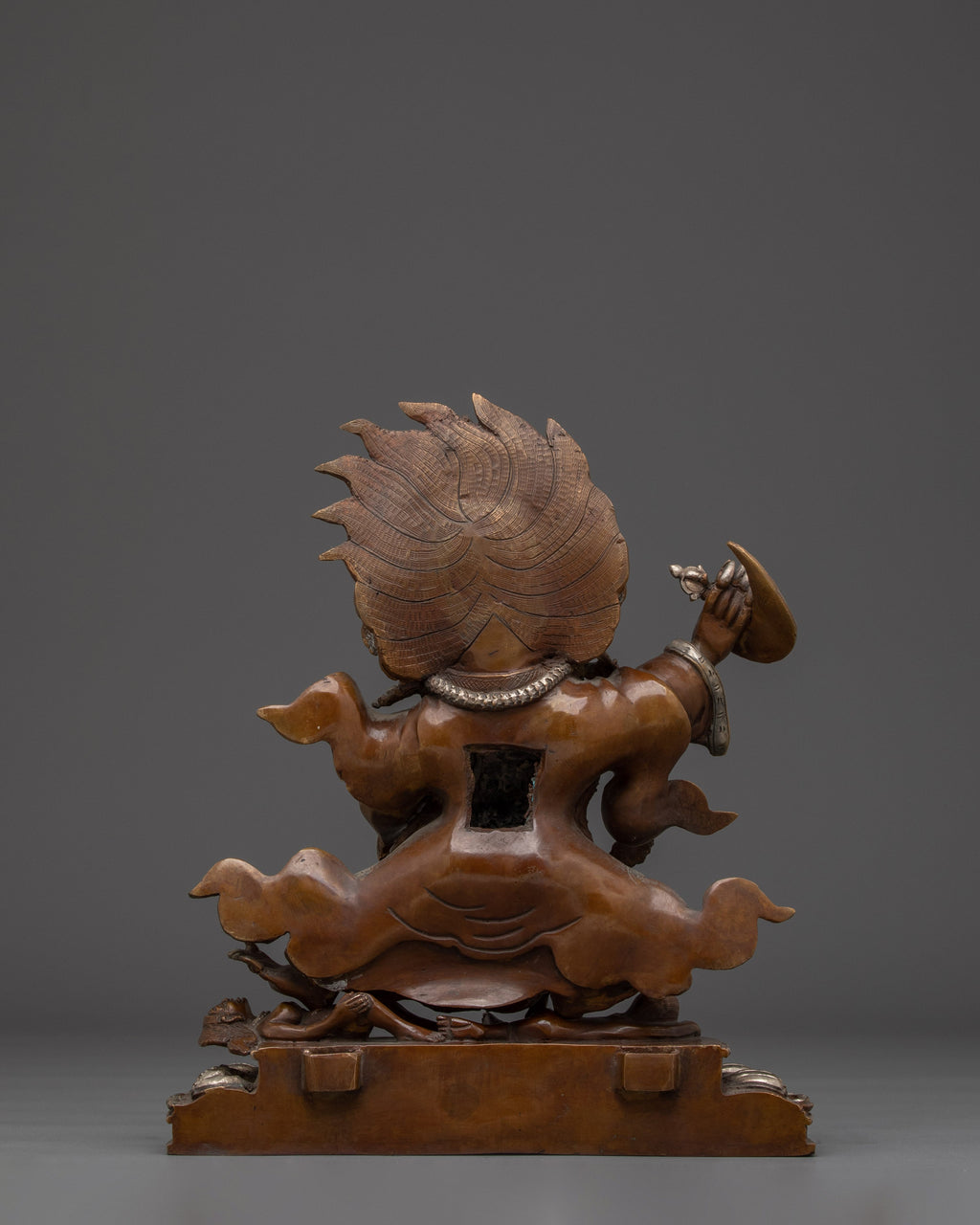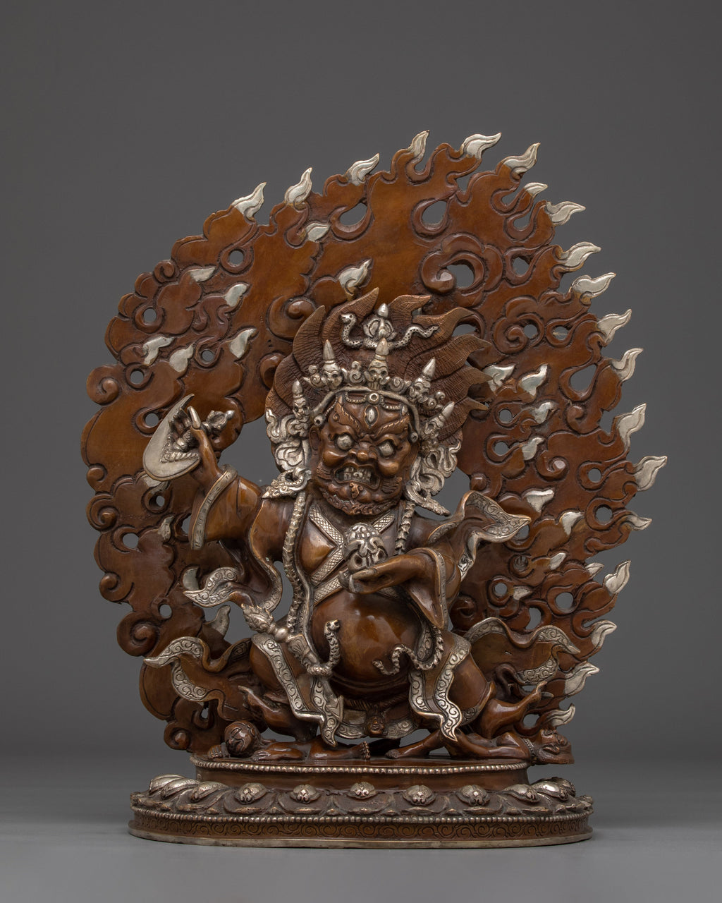 Fierce compassion Deity Mahakala Bernagchen Statue measures 13 inches (33 cm) in height and 10.6 inches (27 cm) at the base. It weighs 4.32 kilograms and is crafted from an oxidized copper body with silver plating. It is as striking in appearance as it is in craftsmanship.