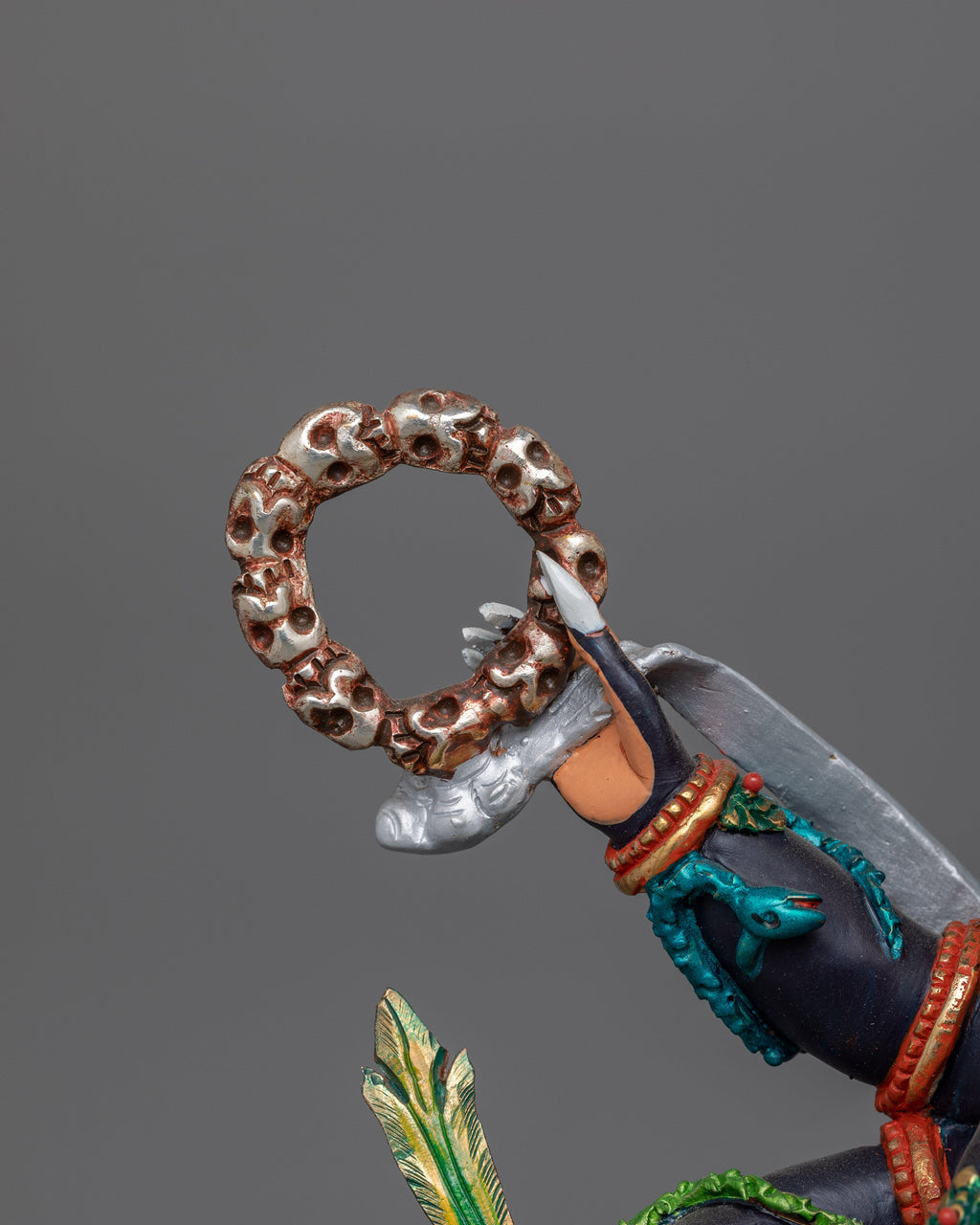 Mahakala is shown with six limbs, each holding a symbolic weapon that represents his power to vanquish difficulties, ignorance, and negativity. His furious visage and active stance reflect his duty as guardian of the Dharma and its practitioners. The superb craftsmanship, along with the glittering gold accents, emphasizes the tremendous presence of this god, making it an invaluable spiritual aid for anyone seeking protection, direction, and the elimination of impediments on their spiritual journey.