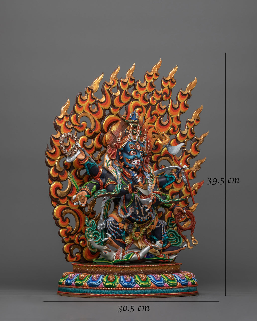 The Fierce Deity Six-Armed Mahakala Statue represents one of Tibetan Buddhism's most revered protector deities. It measures 15.6”/39.5cm in height and 12”/30.5cm at the base adorned with 24K gold gilding, highlighting its divine features and intricate details, acrylic paintings add vibrant colors to enhance its symbolic elements. Made with a copper body, the piece exudes durability, reflecting the skill and devotion of the artisans.