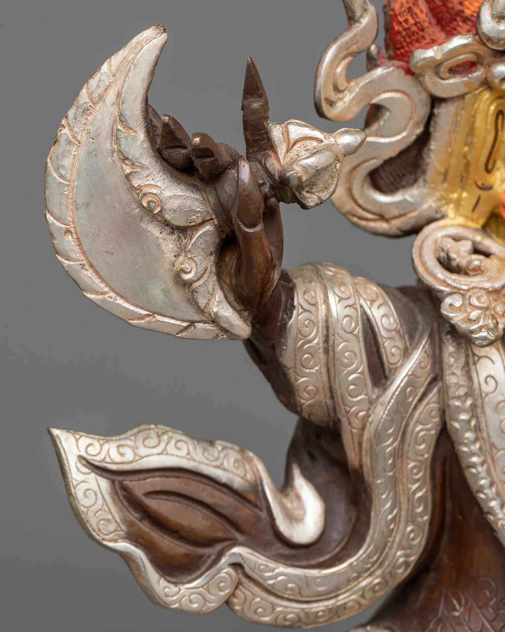 The statue's oxidized copper body radiates a particular, antique-like appeal that is heightened further by silver plating and gold & acrylic paintwork. These features combine to showcase Mahakala's ferocious yet complex characteristics, from his expressive wrathful expression to his dynamic posture. This piece's size and weight make it a striking addition to any collection, providing both aesthetic appeal and spiritual importance.