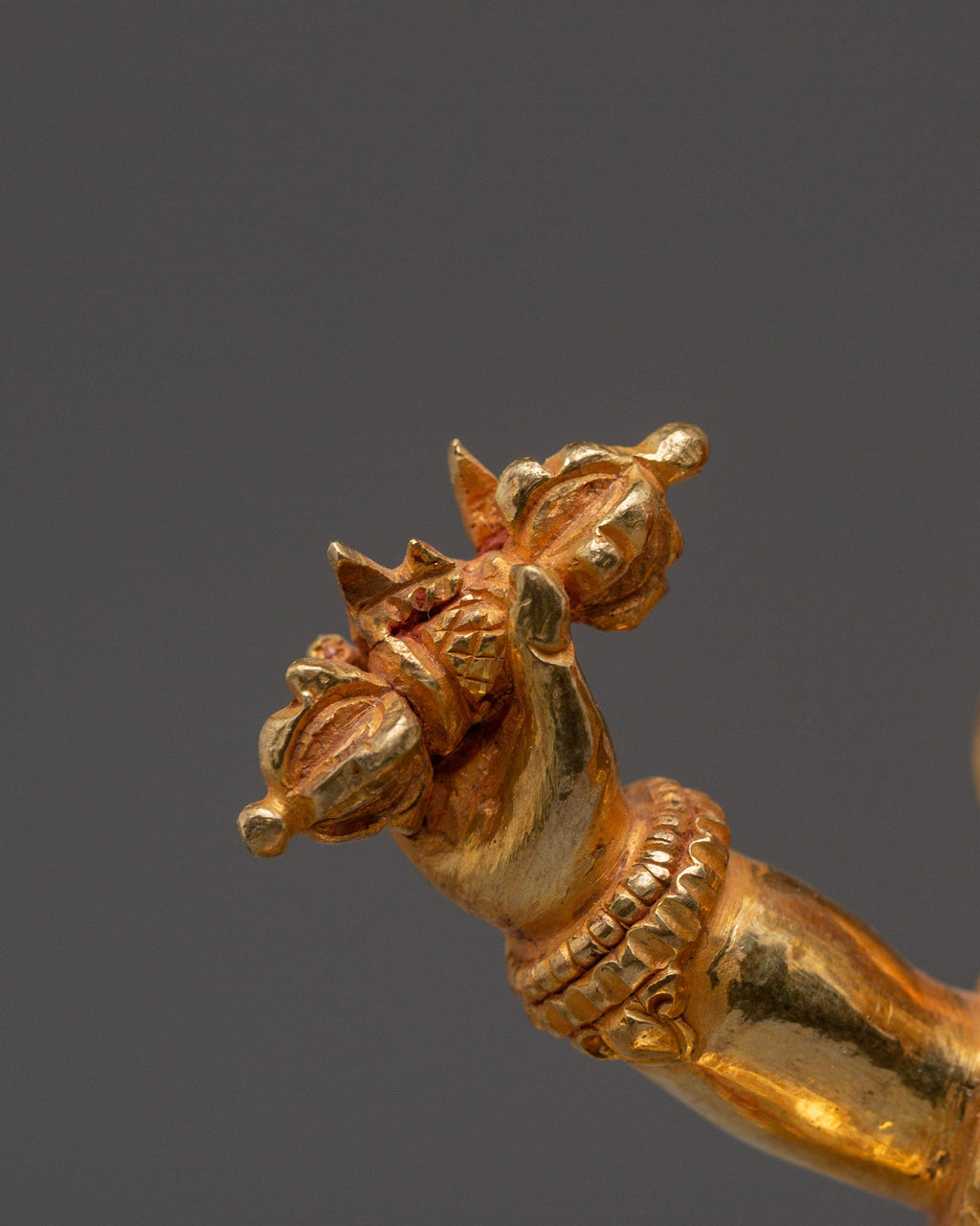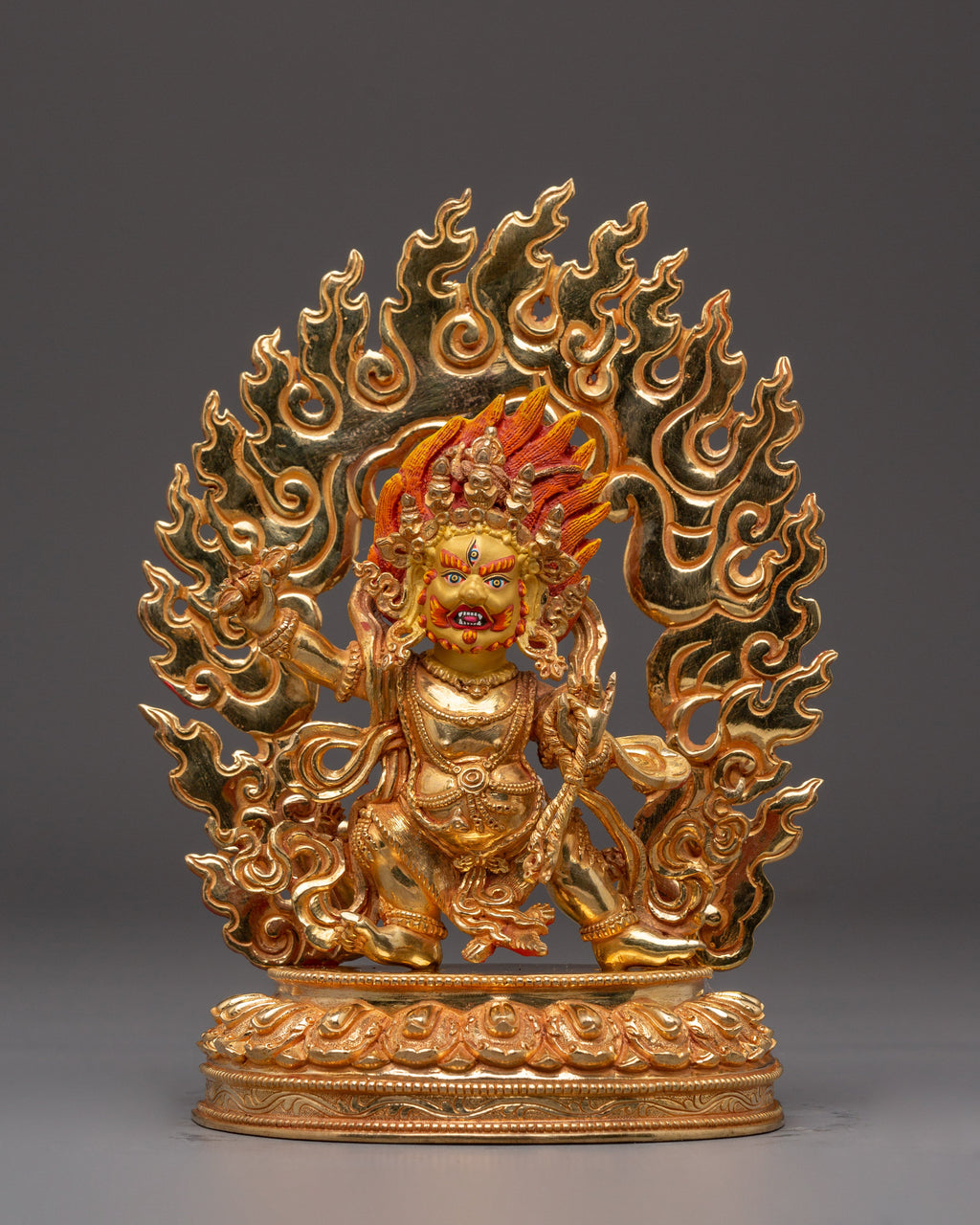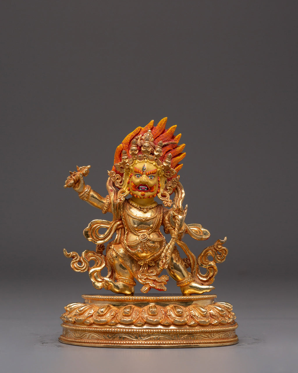 Fierce Wisdom Deity Vajrapani stands 10.8” (27.5 cm) tall with a base width of 8.3” (21 cm) and weighs 2.57 kg. It is handcrafted from a copper body, 24K gold gilding, and detailed gold and acrylic paintings. This powerful and intricately detailed statue is ideal for spiritual spaces, altars, or meditation rooms, symbolizing strength, protection, and unwavering spiritual resolve.