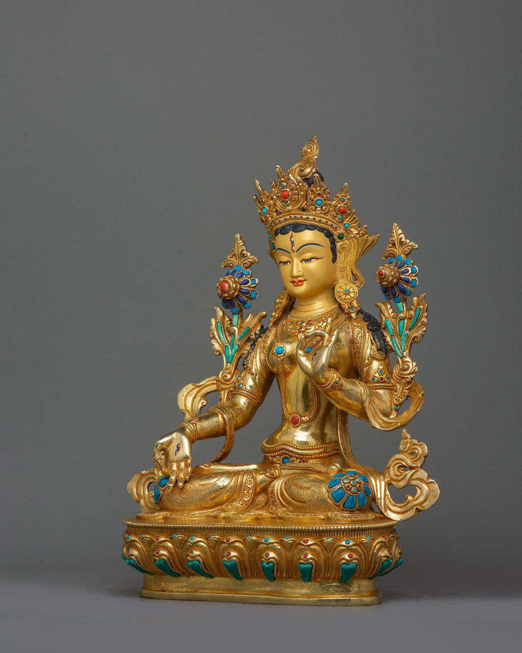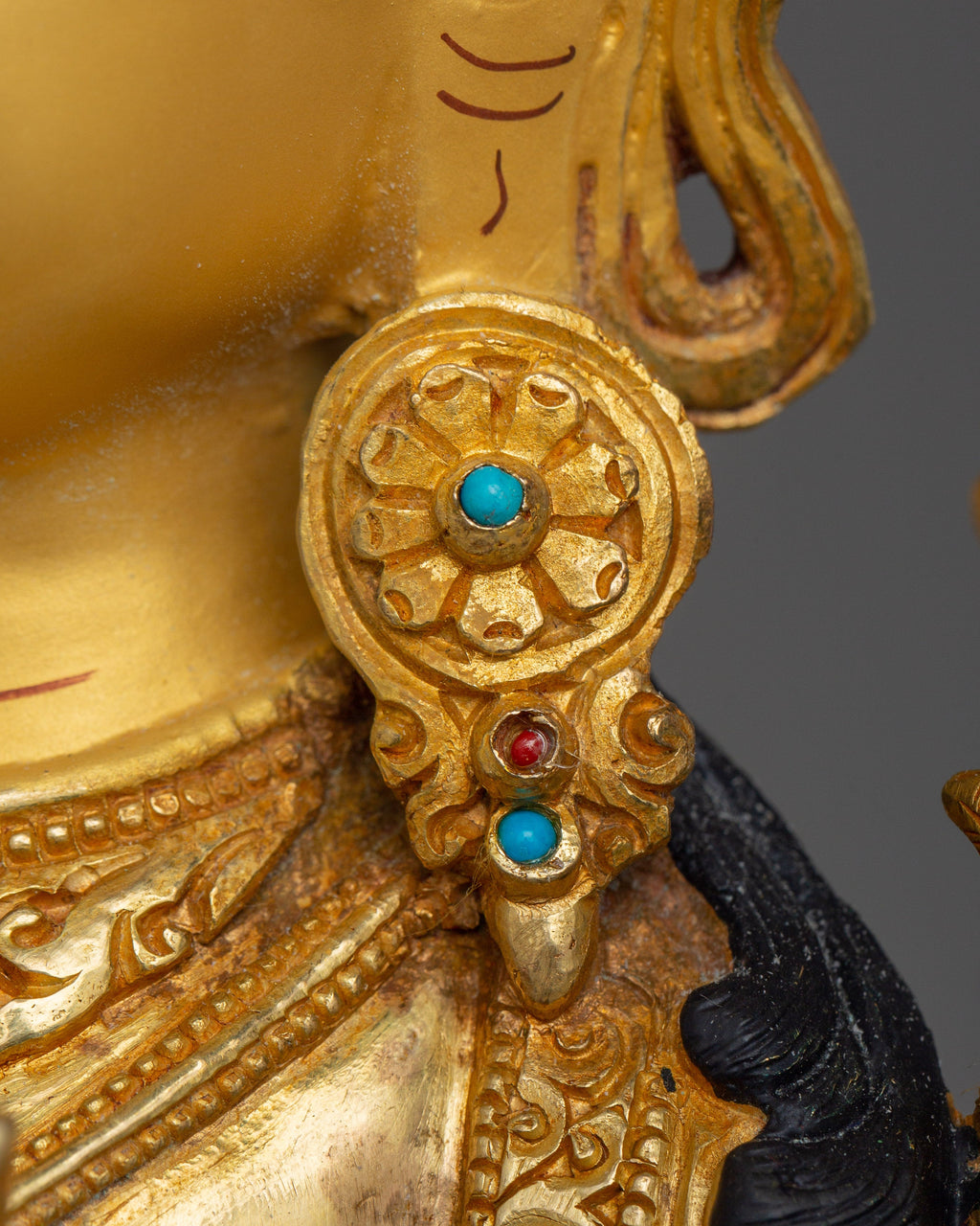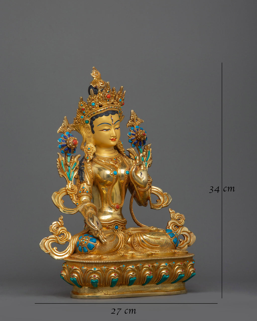 The Figurine of Buddhist Deity White Tara, standing at 13.4”/34cm in height with a base width of 10.6”/27cm, is a representation of compassion and serenity. Expertly crafted with 24K gold gilding and adorned with hand-carved gemstones, this statue radiates divine grace. Designed by talented Nepalese artisans, this detailed sculpture is ideal for altars, meditation areas, or as a meaningful decor item for individuals seeking awareness in their daily life.