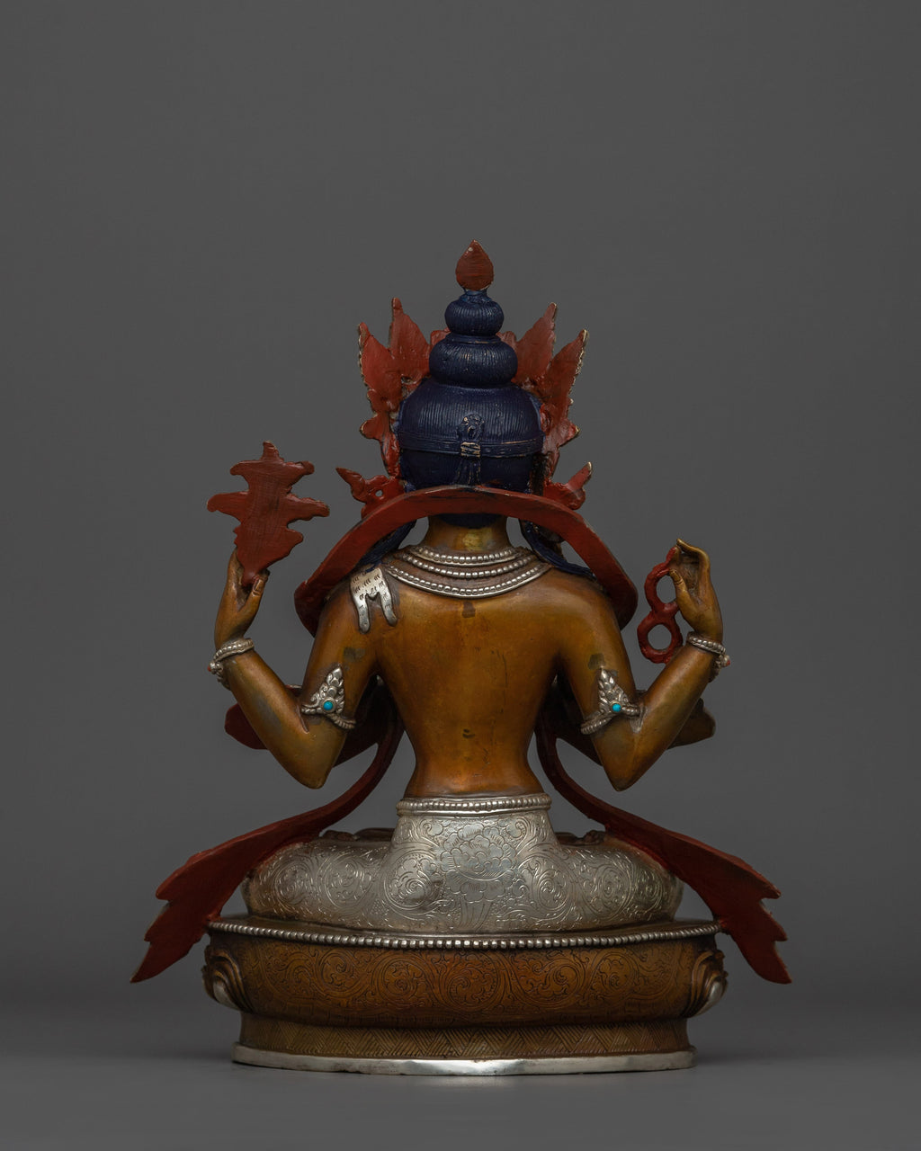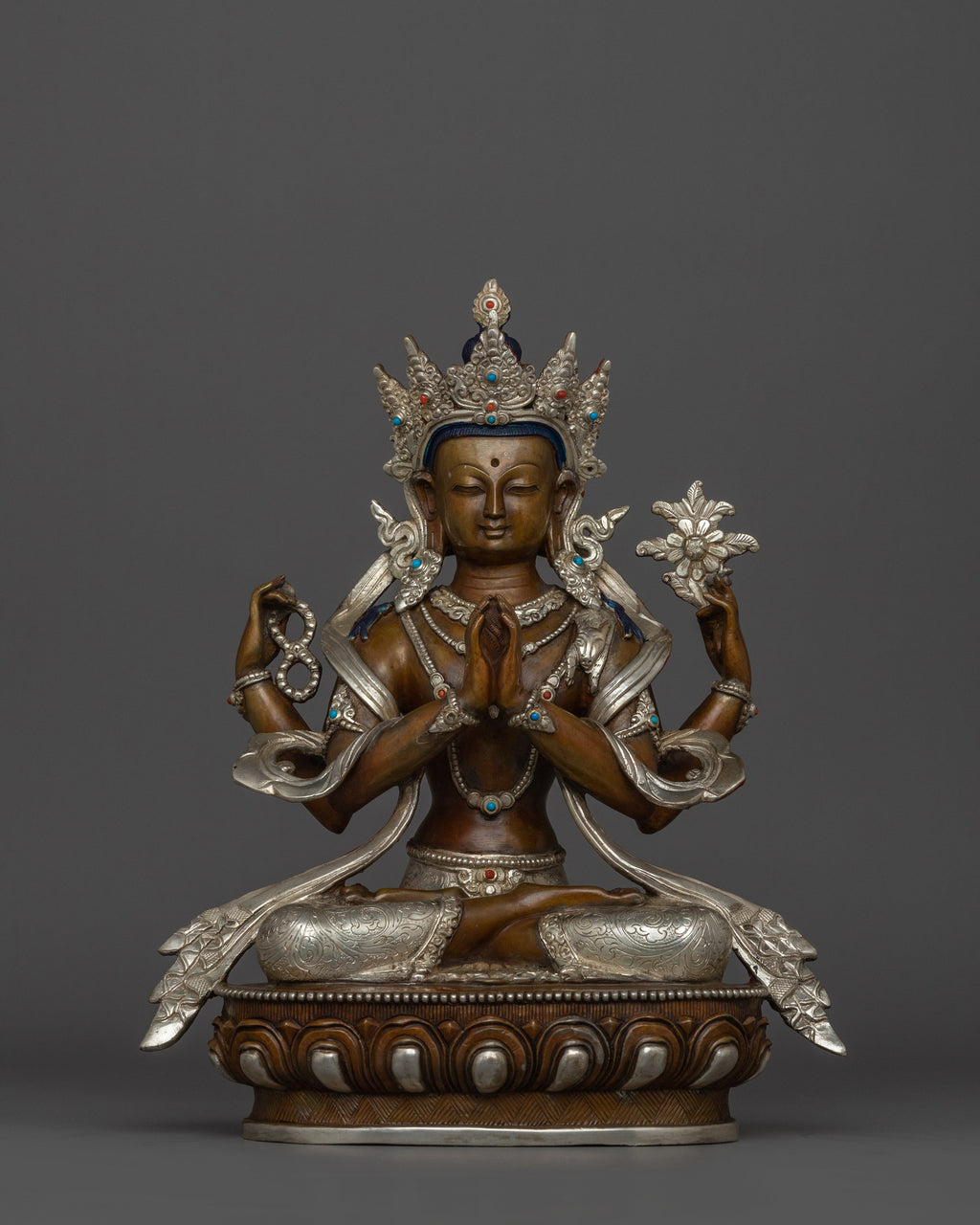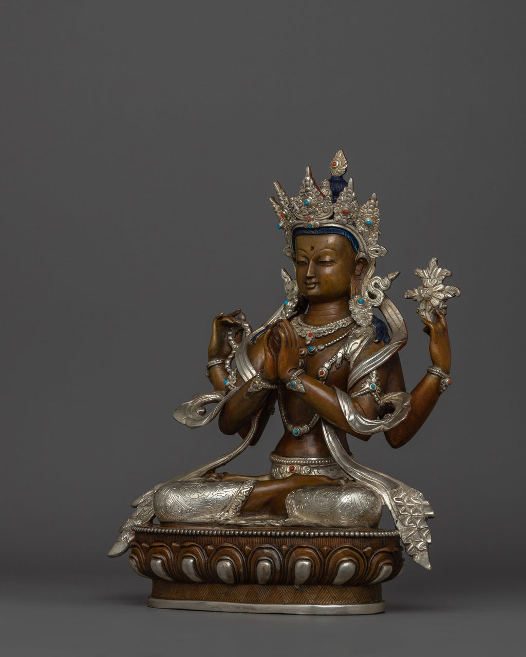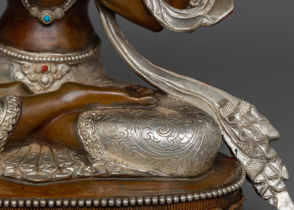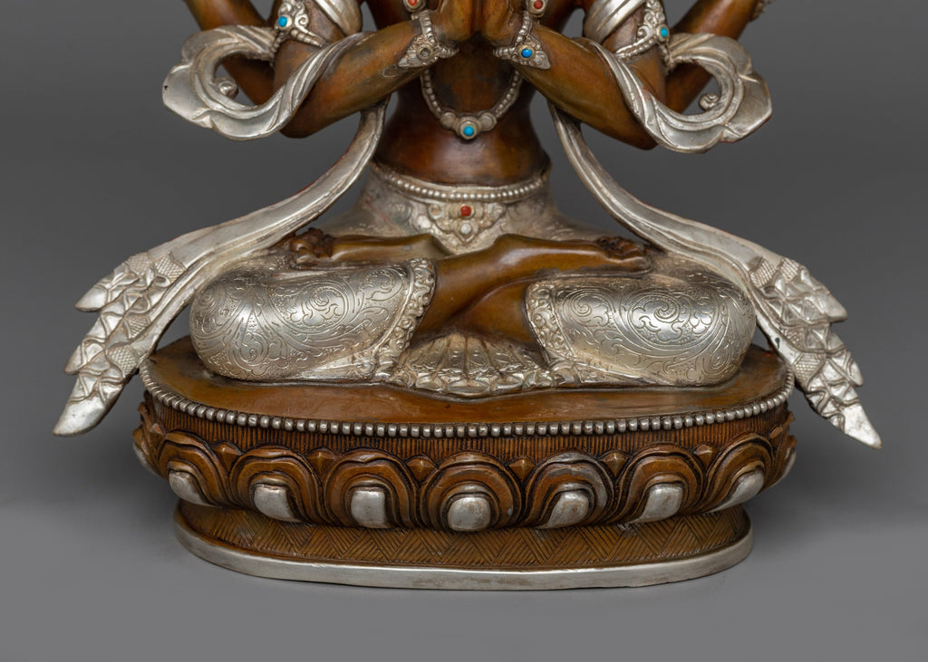 Figurine of Compassionate Deity Chenrezig stands at 11 inches (28 cm) with a base measuring 8.9 inches (22.5 cm). Weighing approximately 2.99 kilograms, it is made from an oxidized copper body and silver-plated, giving it a timeless and sacred appearance. The fine detailing and traditional craftsmanship reflect the deep reverence for Chenrezig as the embodiment of compassion in Tibetan Buddhism, making it a meaningful addition to any spiritual space or altar.