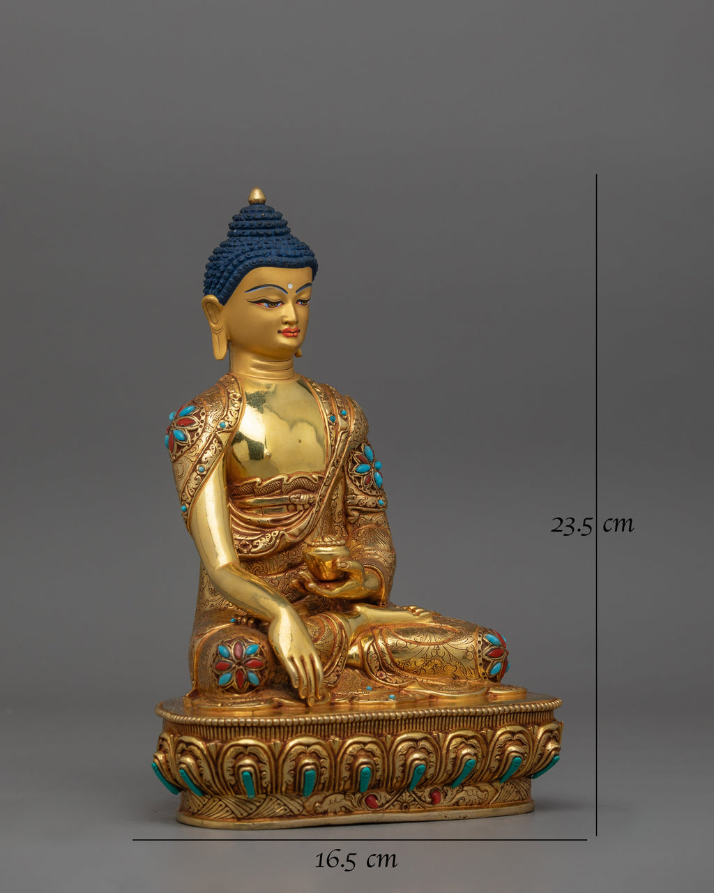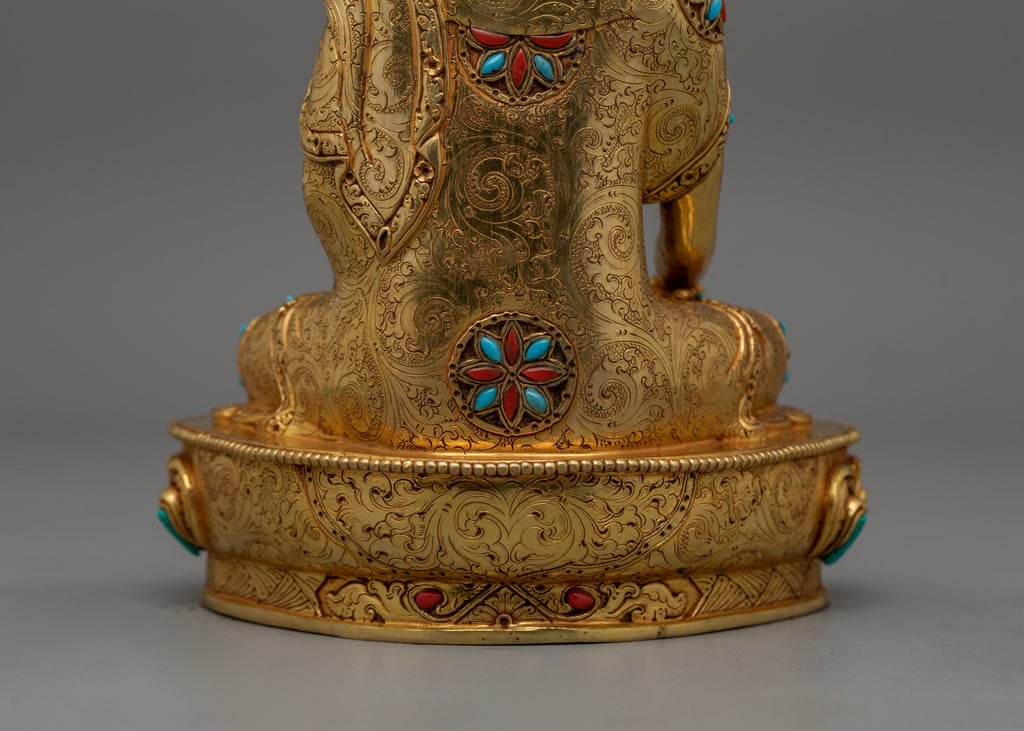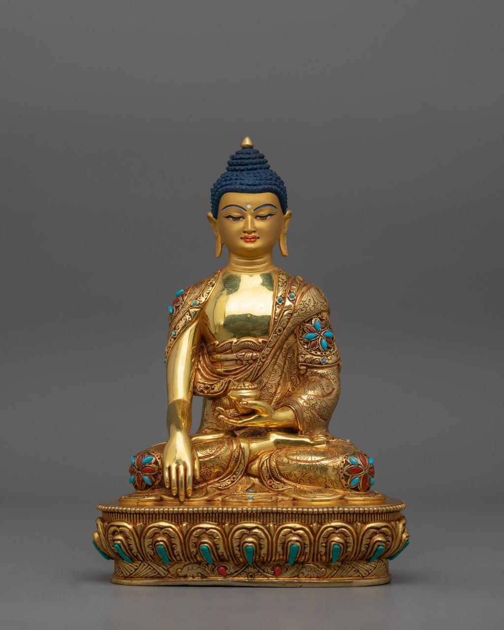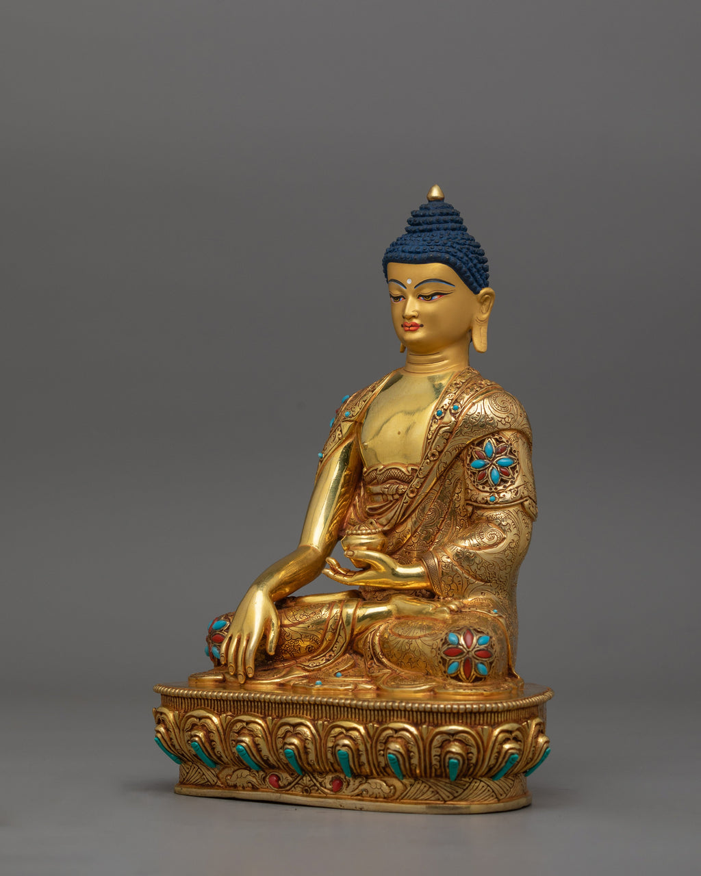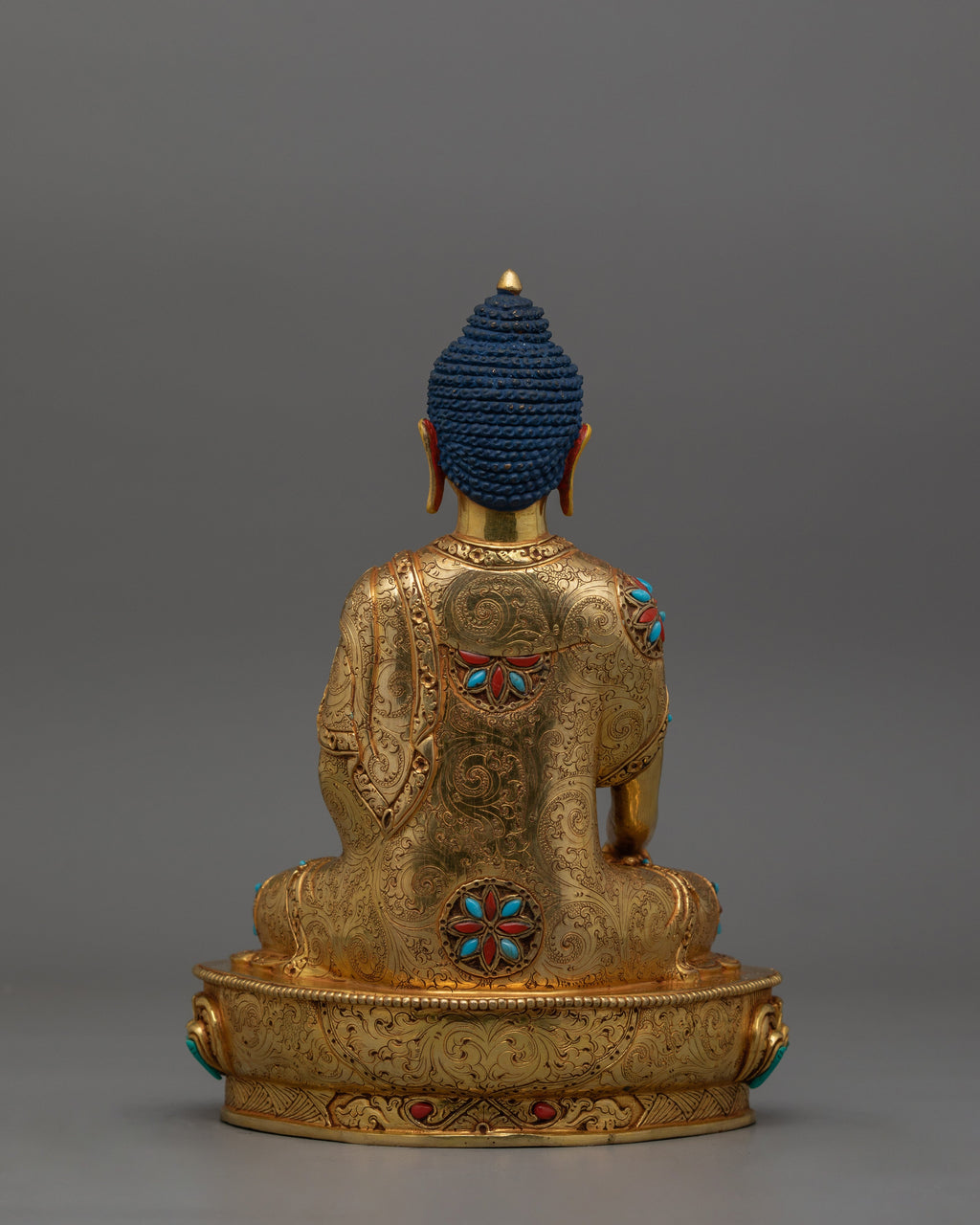 Shakyamuni Buddha is depicted sitting in the lotus pose (padmasana), indicating his steady concentration and mastery over the distractions of the material world. His right hand stretched toward the earth in bhumisparsha mudra, represents his moment of enlightenment, inviting the earth to witness his waking. The left hand, lying gently in his lap in dhyana mudra, depicts the profound state of meditation and mindfulness that leads to insight and clarity.