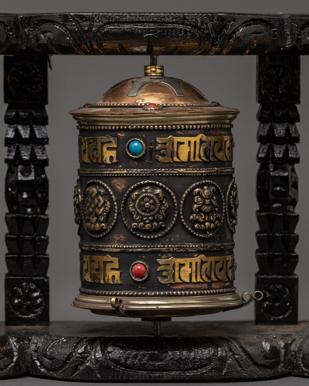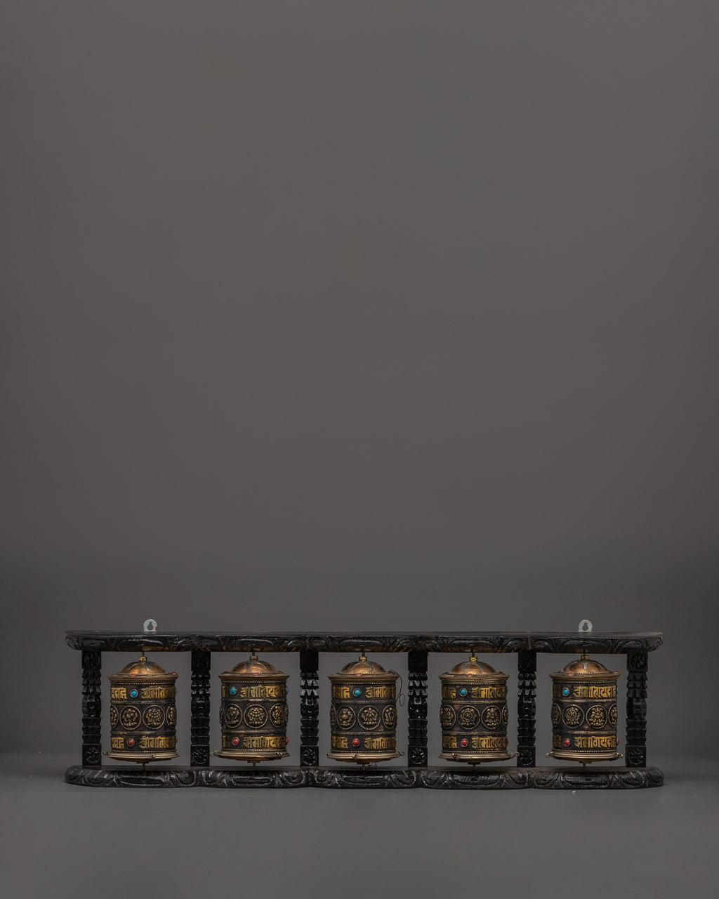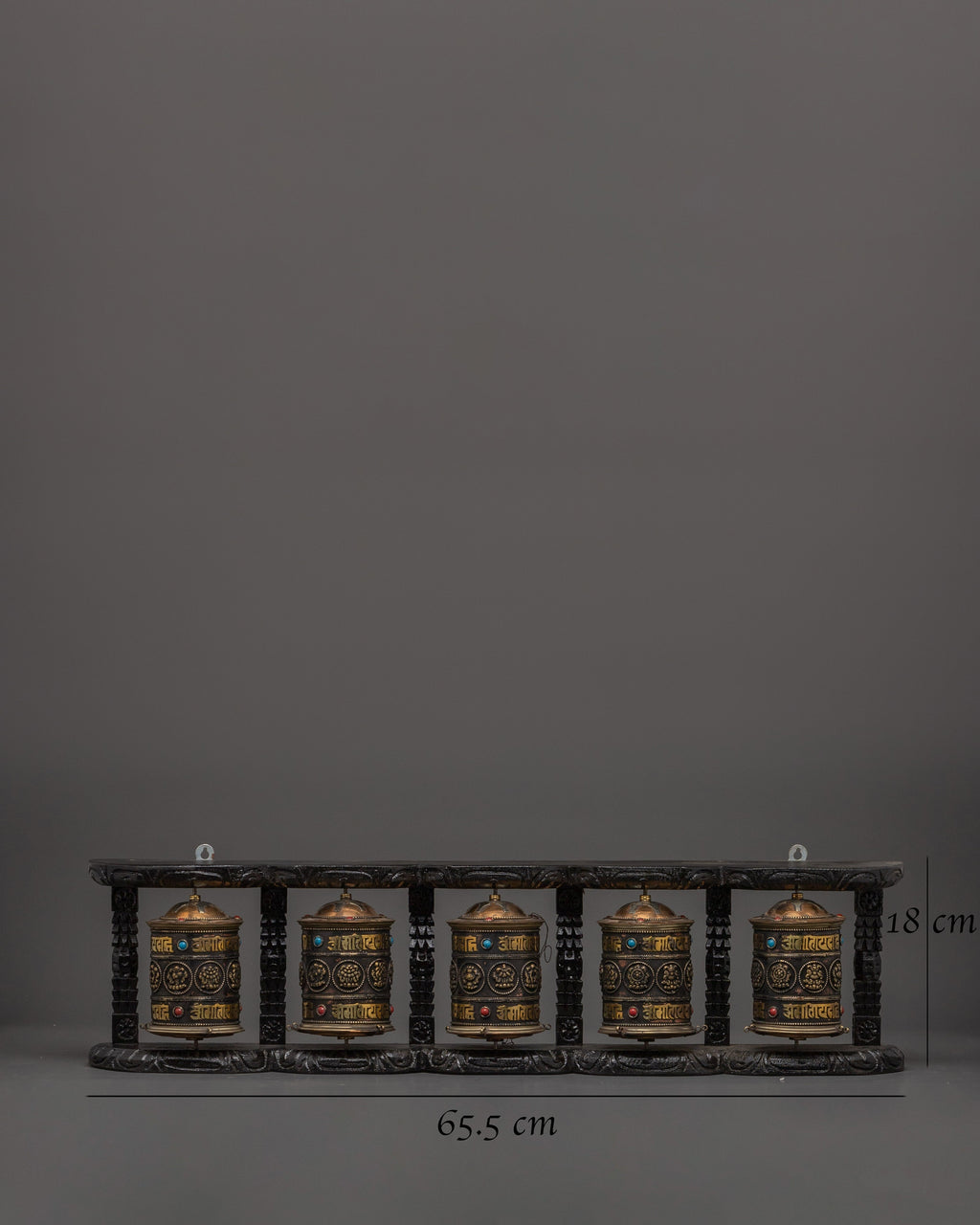 This set of five Tibetan Prayer Wheels on a Wooden Frame will bring serenity, presence, and spiritual energy into your environment. Each prayer wheel is beautifully crafted, featuring a copper and brass body adorned with white metal and engraved with religious mantras. This special item, beautifully displayed in a wooden frame and decorated with carefully selected jewels, embodies the traditional Tibetan spirit of creativity and purpose. It stands 18cm tall and 65.5cm wide, making it an attractive and meaningful centerpiece for your spiritual shrine, meditation room, or Zen-inspired home design.