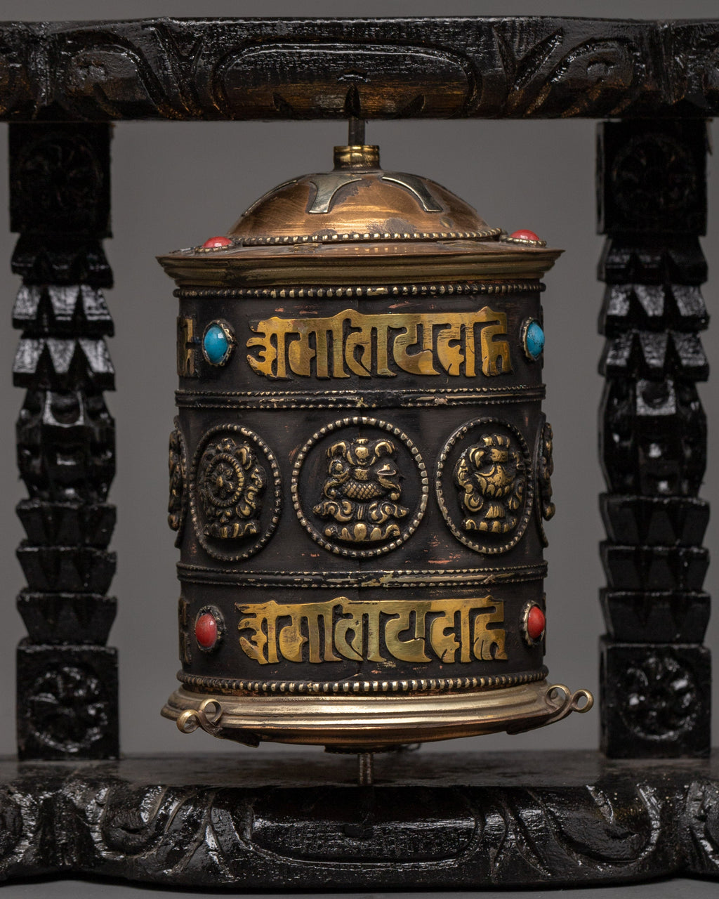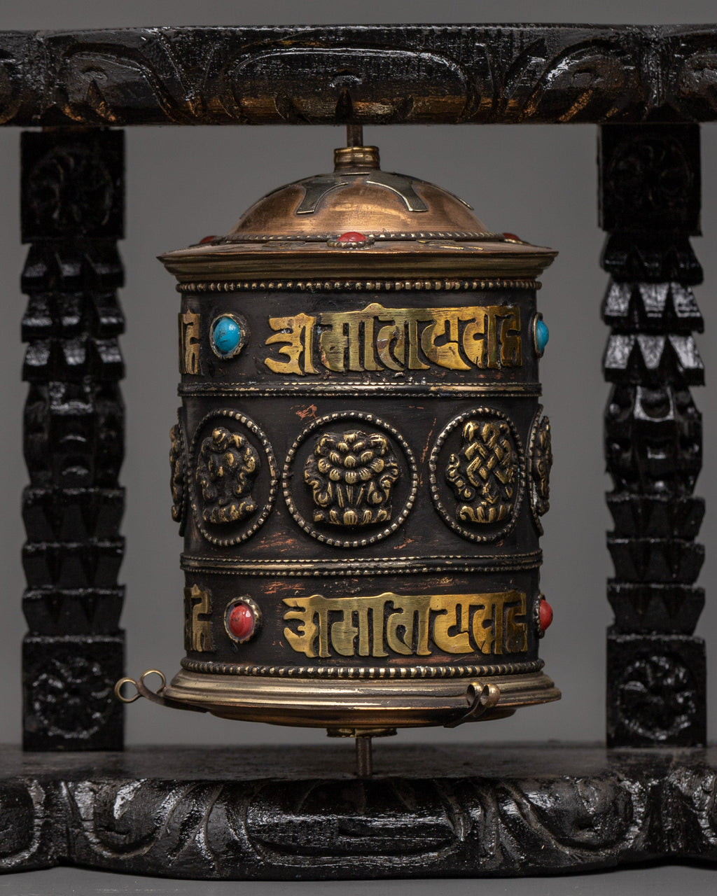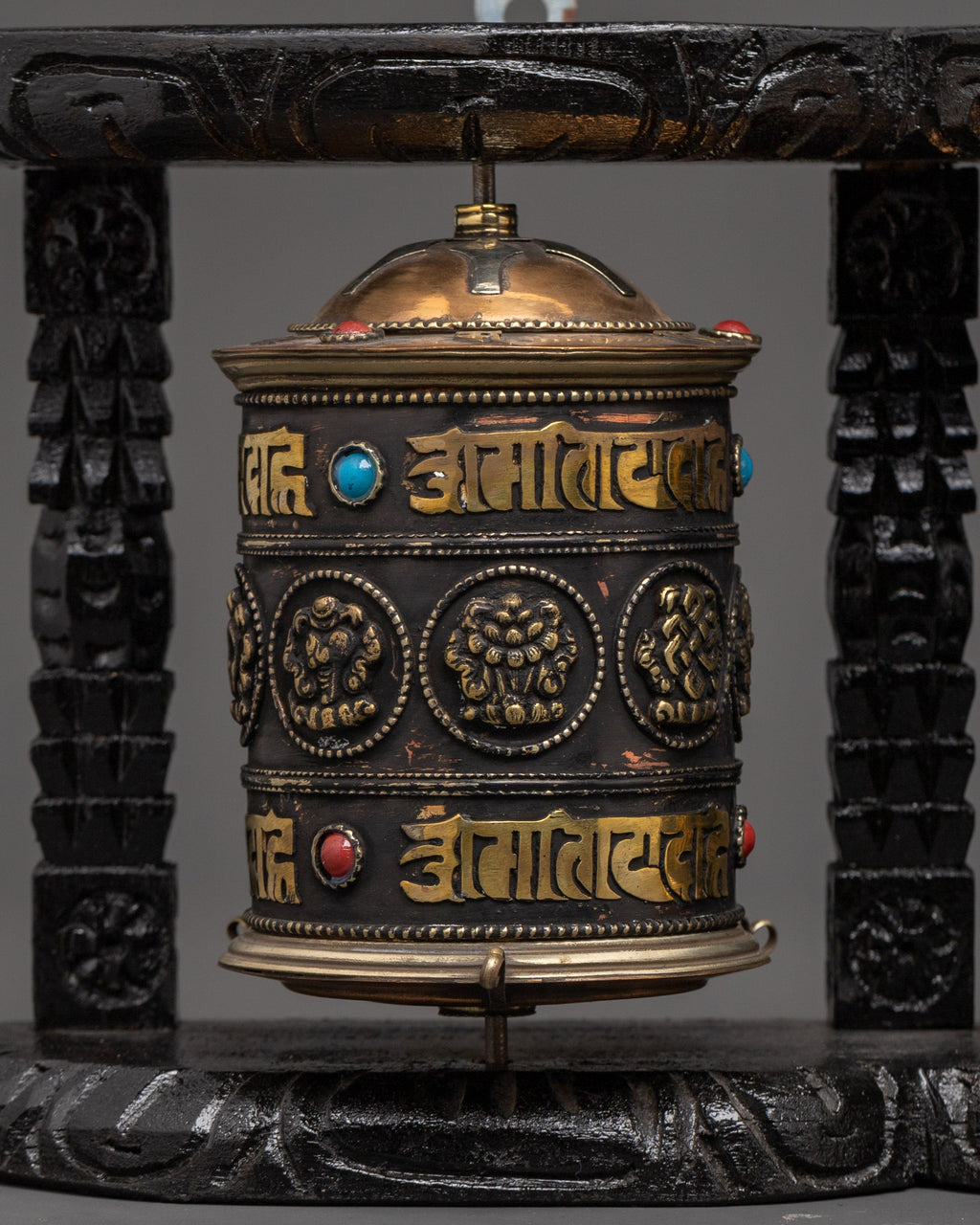 This set of five Tibetan Prayer Wheels on a Wooden Frame will bring serenity, presence, and spiritual energy into your environment. Each prayer wheel is beautifully crafted, featuring a copper and brass body adorned with white metal and engraved with religious mantras. This special item, beautifully displayed in a wooden frame and decorated with carefully selected jewels, embodies the traditional Tibetan spirit of creativity and purpose. It stands 18cm tall and 65.5cm wide, making it an attractive and meaningful centerpiece for your spiritual shrine, meditation room, or Zen-inspired home design.