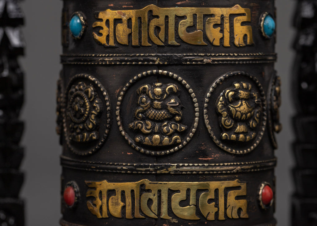 A prayer wheel is a cylindrical device on a spindle, used in Tibetan Buddhism. It is typically inscribed with the mantra "Om Mani Padme Hum" and rotated by hand as a form of spiritual practice and to accumulate merit. Spinning the wheel is believed to have the same spiritual benefits as reciting the mantra verbally. The use of prayer wheels is widespread in Tibetan Buddhism and has spread to other cultures.