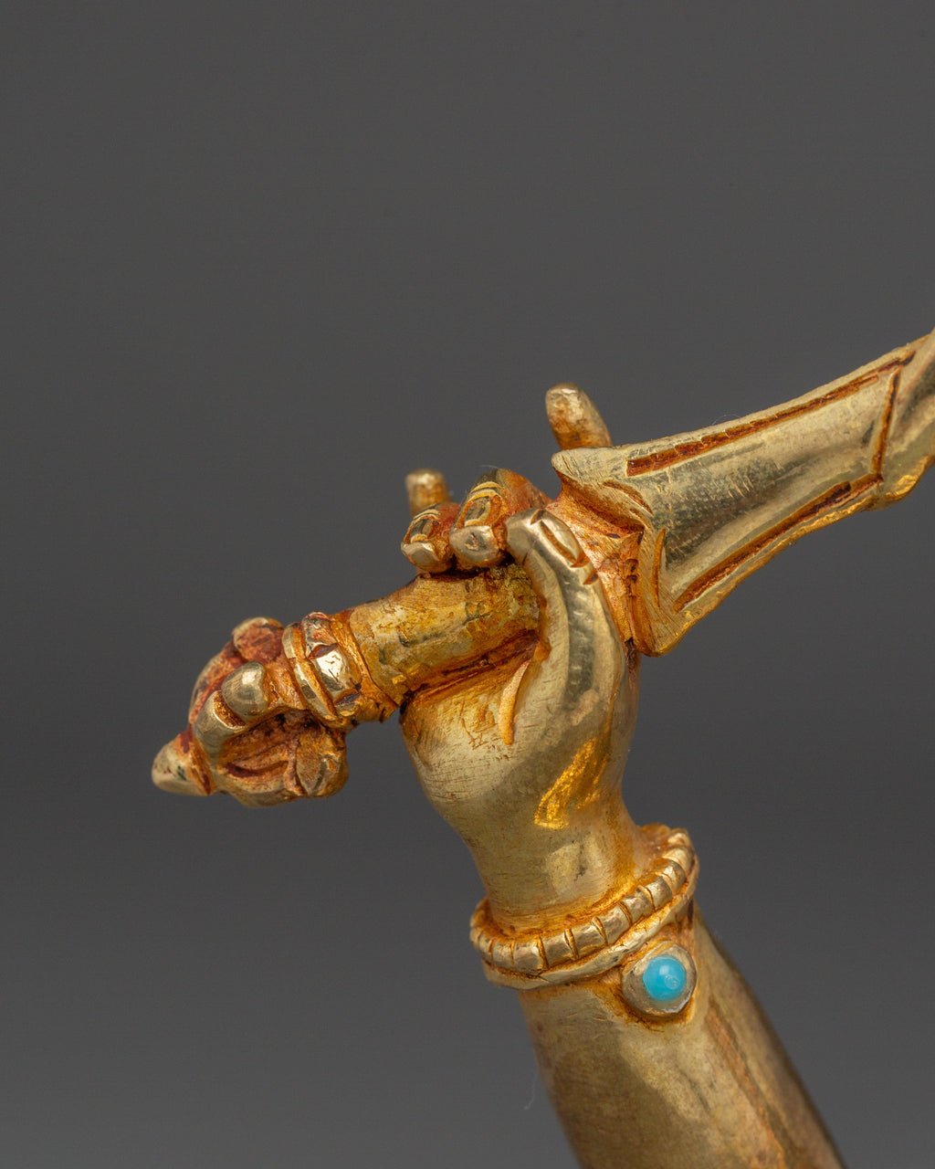 This Tibetan Flaming Sword Bodhisattva Manjushri statue stands at 8.7”/22cm in height and 7.3”/18.5cm at the base, weighing 1.36 kg. Made from a copper body with 24K gold gilding, gold and acrylic paintings, and embellished with gemstones, it depicts Manjushri holding his flaming sword, symbolizing the cutting of ignorance and the awakening of wisdom. Expertly handcrafted, this piece is ideal for altars, meditation spaces, or spiritual decor collections.