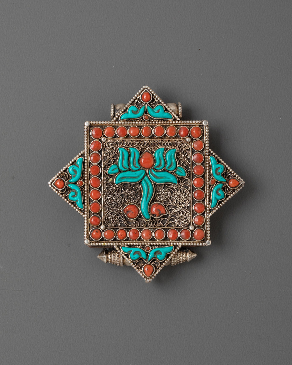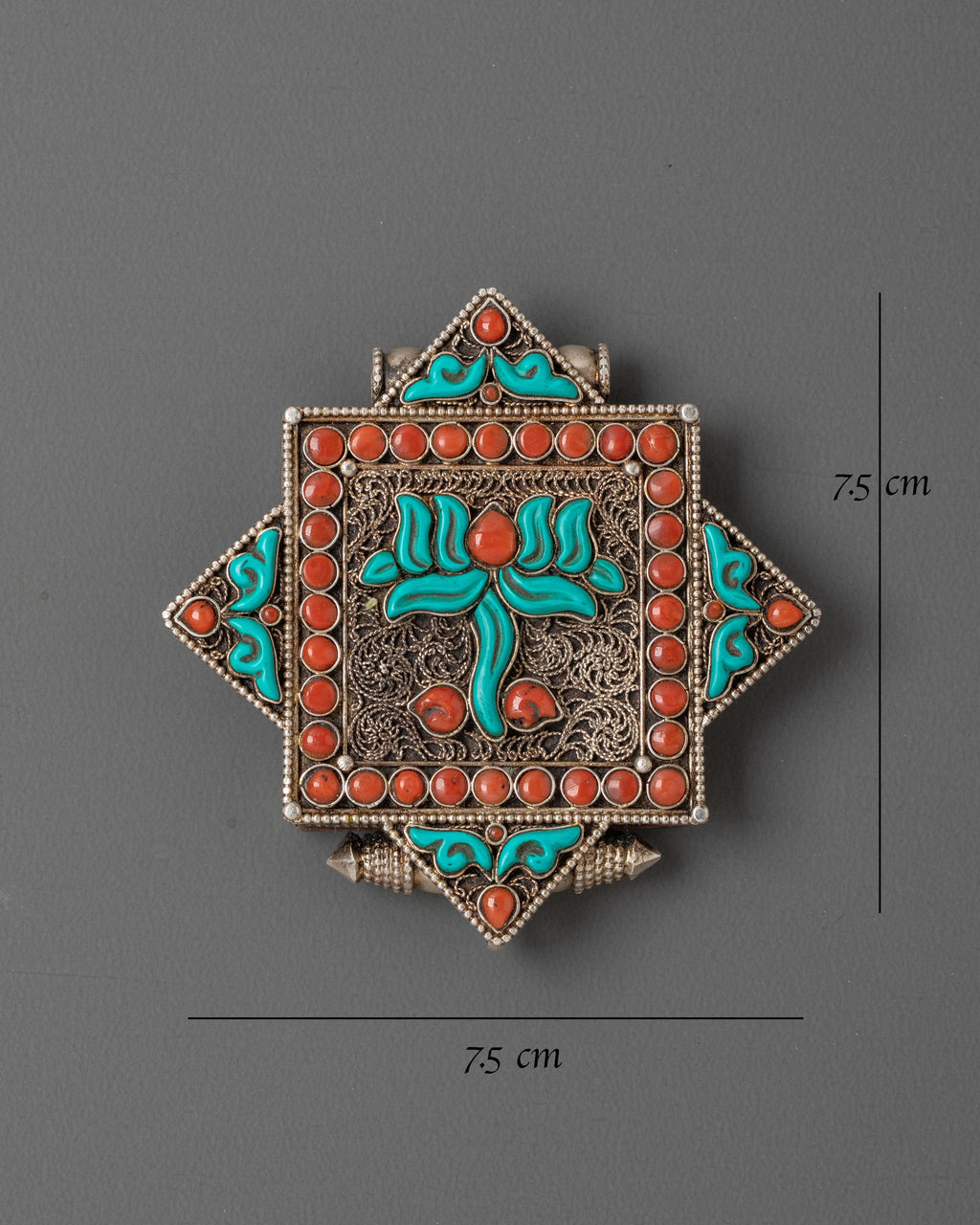 The Flower Design Ghau Box Locket is a stunning handcrafted Tibetan pendant that holds spiritual artifacts, mantras, or prayers. This locket, which is 7.5cm high and 7.5cm wide, is crafted from silver and features semi-precious Coral and Turquoise stones that symbolize protection, healing, and abundance. The flower design in the middle depicts spiritual development, blossoming wisdom, and the beauty of life's natural cycle. This precious amulet is perfect for anyone seeking spiritual direction, inner serenity, and heavenly favors.