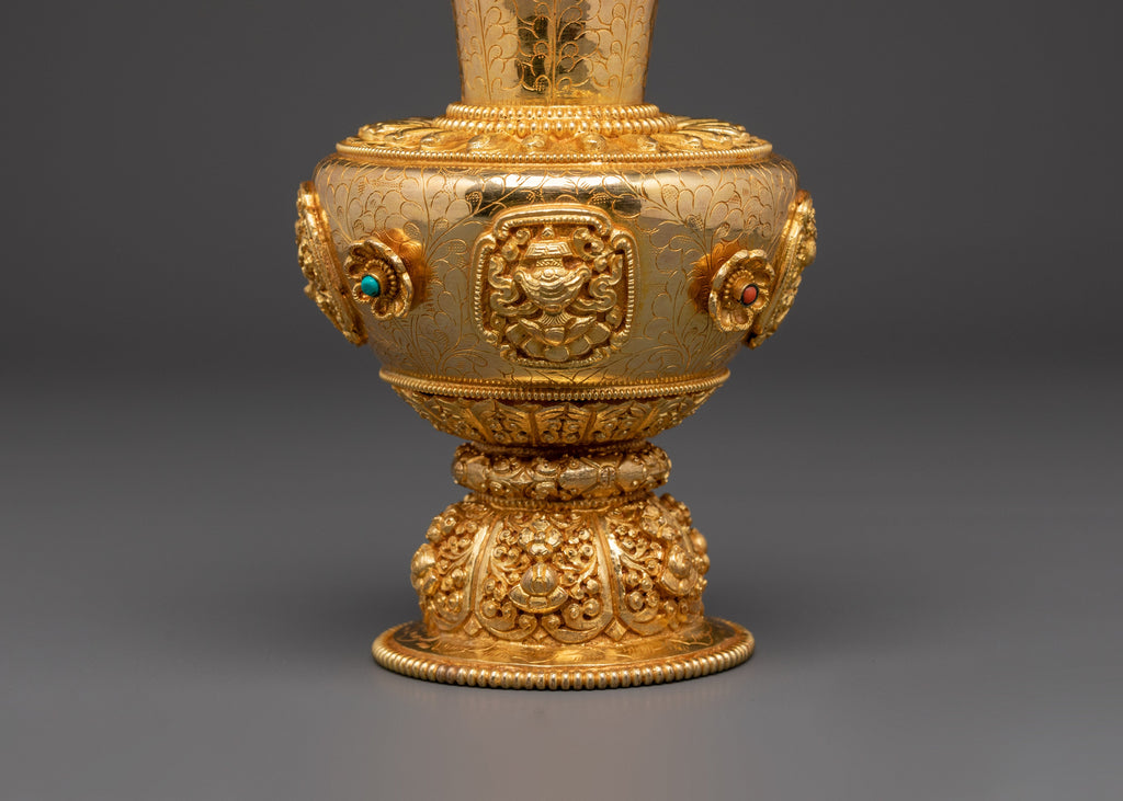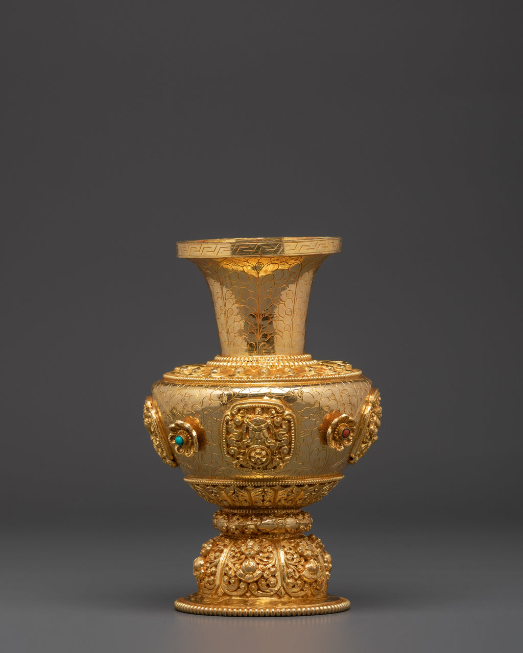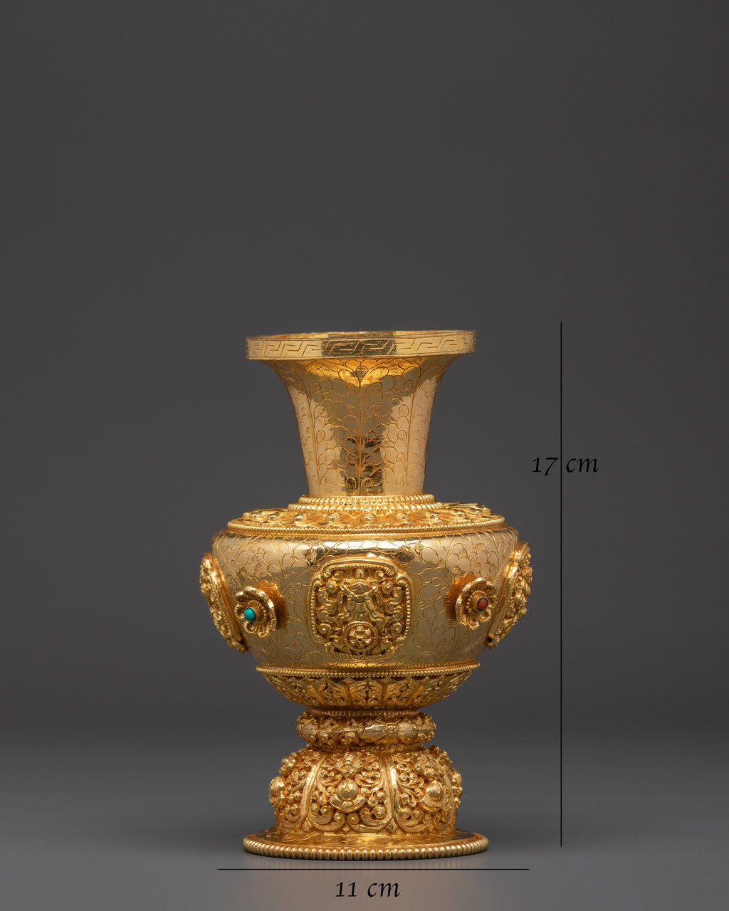 Measuring 17cm in height and 11cm in width, and weighing 0.73kg, this vase carries both elegance and deep symbolic value. The gold-plated surface represents purity and wisdom, while the copper base reflects traditional Himalayan craftsmanship. Used in puja ceremonies and meditation spaces, it holds flowers and offerings that embody devotion and respect for the Buddha and deities. Beyond its ritual purpose, it also serves as a meaningful piece of spiritual decor for altars, homes, or meditation rooms.