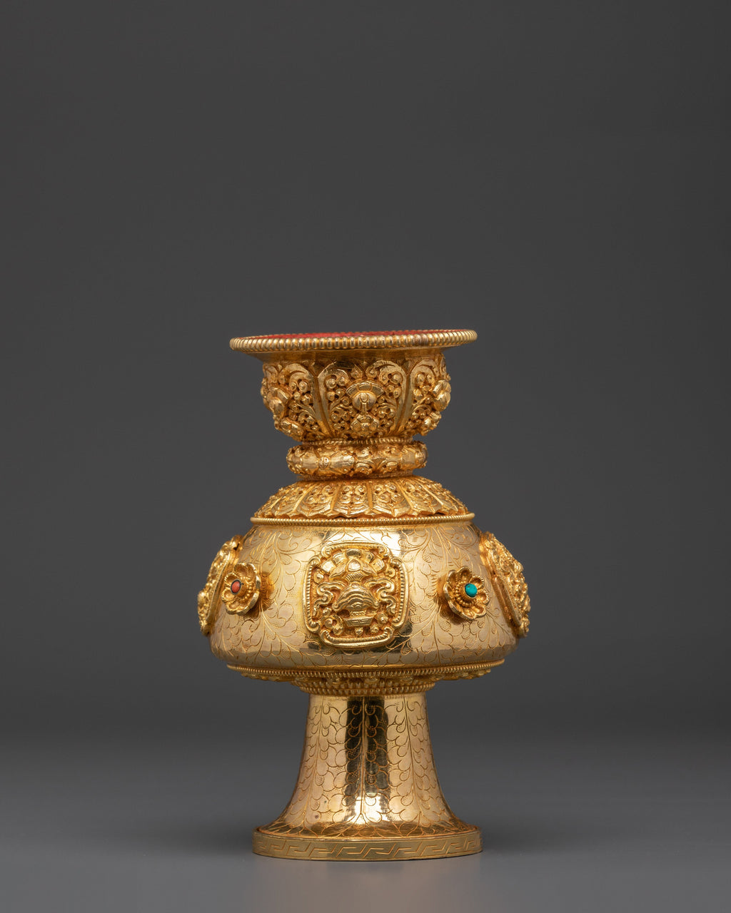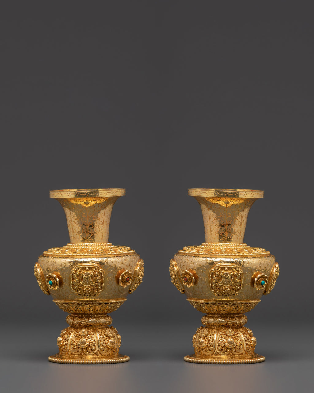 This Flower Vase for Ritual Offering is a sacred Tibetan Buddhist altar piece, handcrafted from a copper body and finished with radiant gold plating. In Buddhist tradition, flower vases symbolize purity, generosity, and the impermanence of life. They are commonly placed on altars as offerings to enlightened beings, inviting blessings, peace, and spiritual harmony into one’s home or shrine.