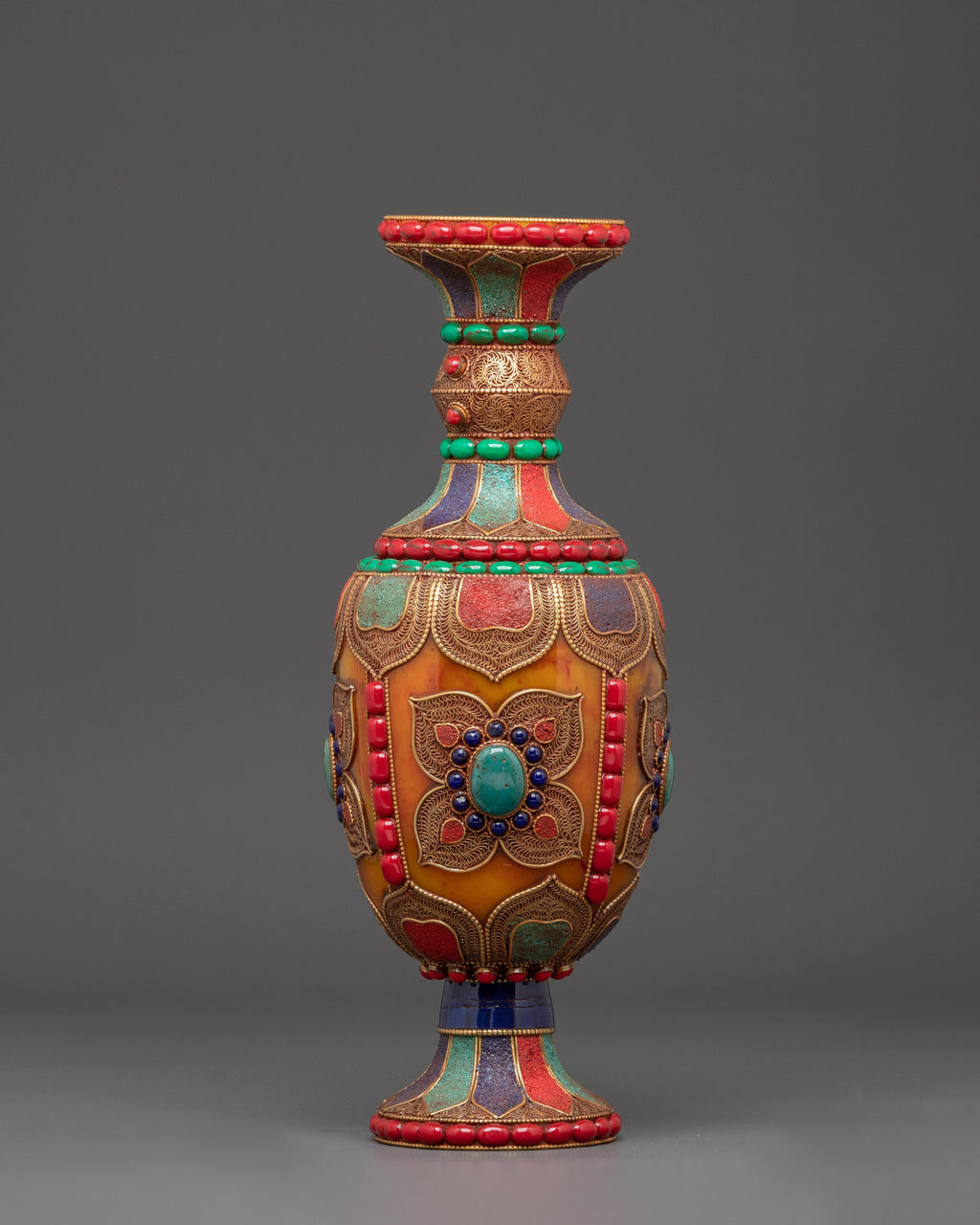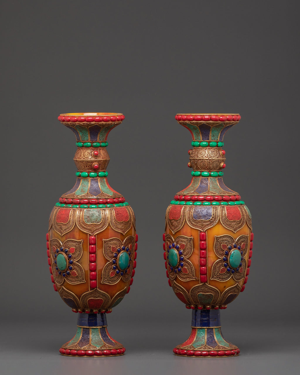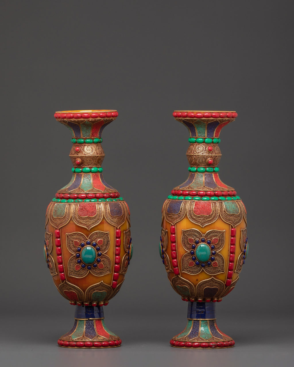 Beyond its visual appeal, this vase set represents the spiritual core of Himalayan culture. Natural stones, such as coral and turquoise, are believed to provide positive energy and protection. Handcrafted by expert artisans, these vases not only honor old skills but also add a significant, symbolic touch to your home decor.