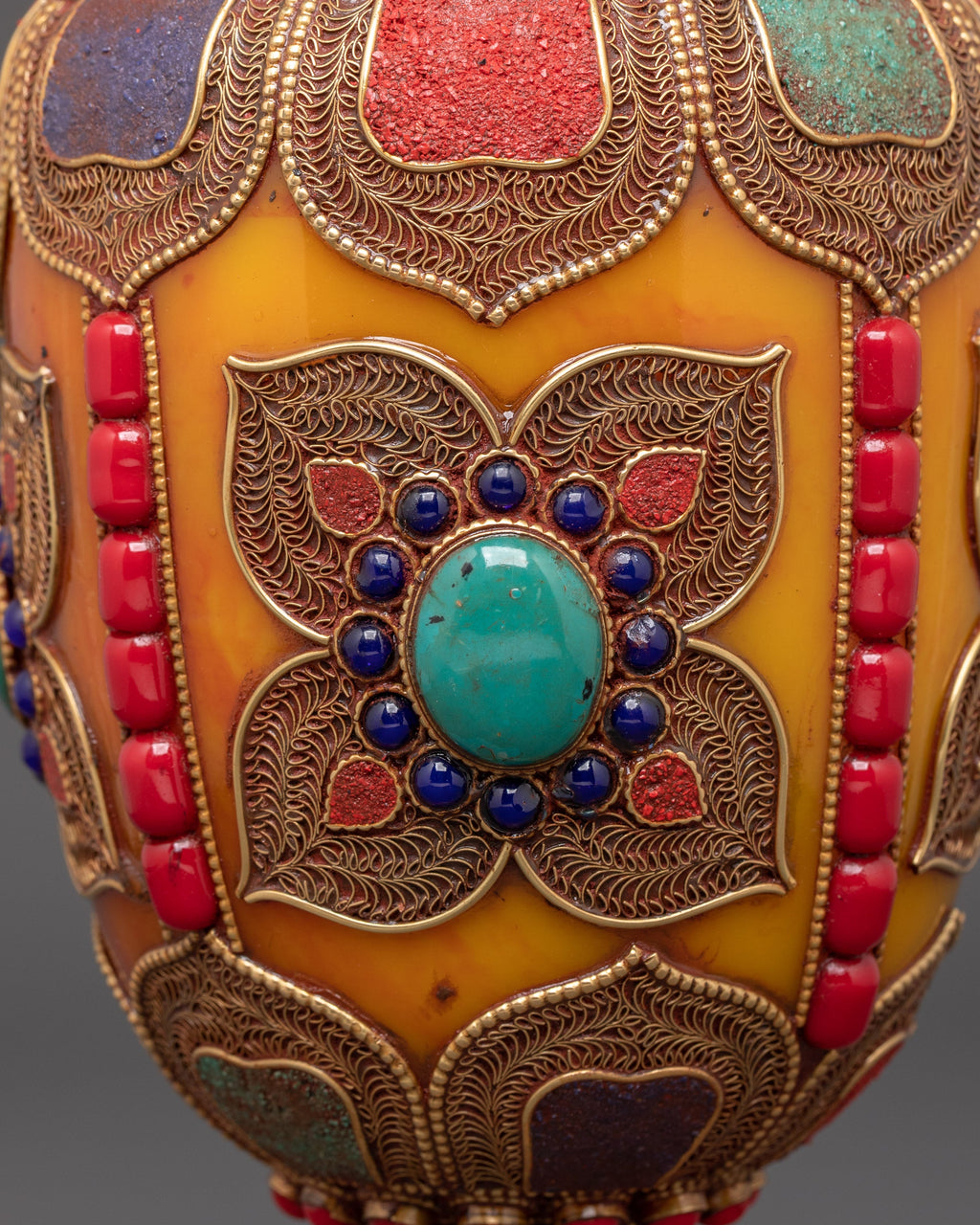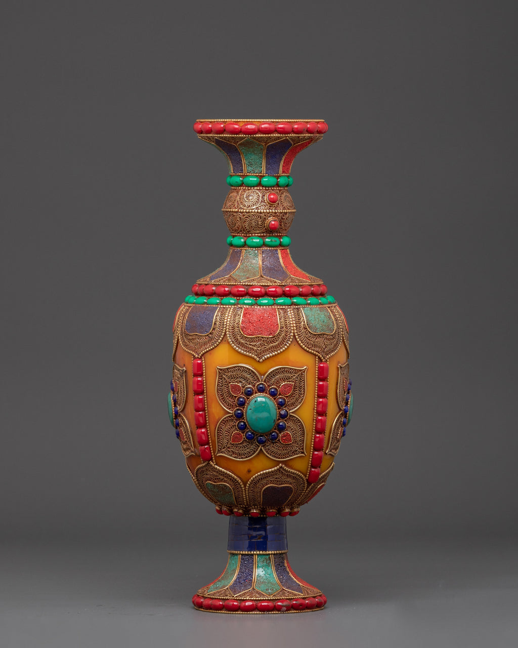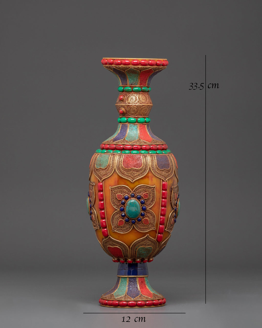 Beyond its visual appeal, this vase set represents the spiritual core of Himalayan culture. Natural stones, such as coral and turquoise, are believed to provide positive energy and protection. Handcrafted by expert artisans, these vases not only honor old skills but also add a significant, symbolic touch to your home decor.