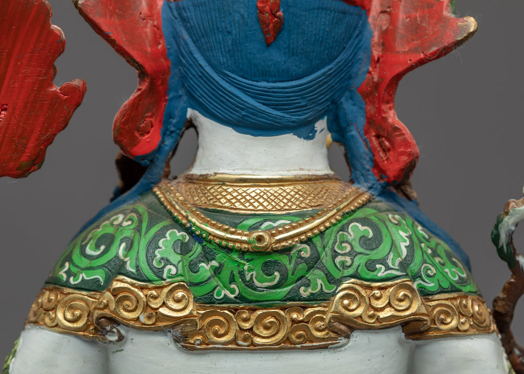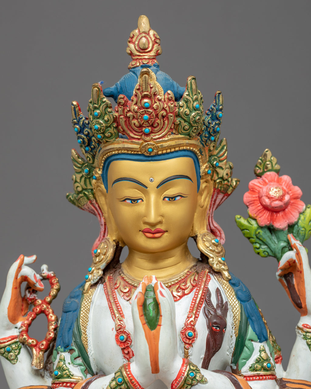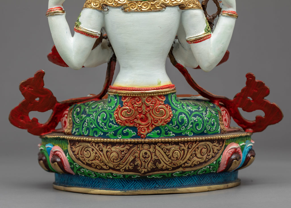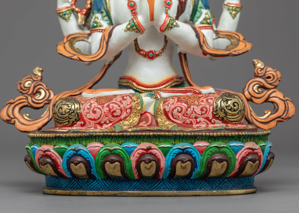 The Four Arm Chenrezig Avalokiteshvara sculpture was carved by hand at our workshop in Nepal. We have masterfully crafted this sculpture of the Chenrezig using a copper body and then gilded the statue with genuine 24k gold. The statue was then finely painted with various acrylic colors that highlight the details of the statue as well as the intricate design patterns of the statue. We have depicted the deity calmly sitting on a moon-shaped lotus seat. He has a full lotus in his left hand and rosary beads in his right hand, two of which are clasped in front in a gesture of prayer, encasing a wishful fulfilling crystal. For a practitioner like you, this beautiful Four Arm Chenrezig statue will make a perfect gift.