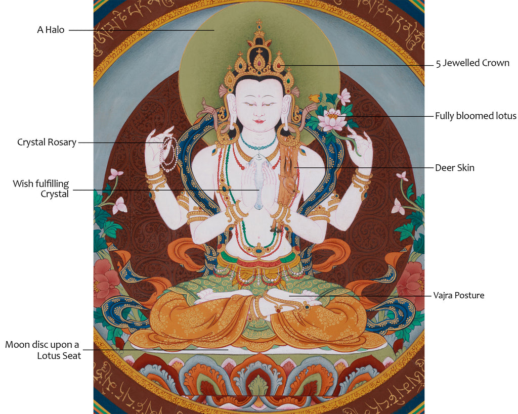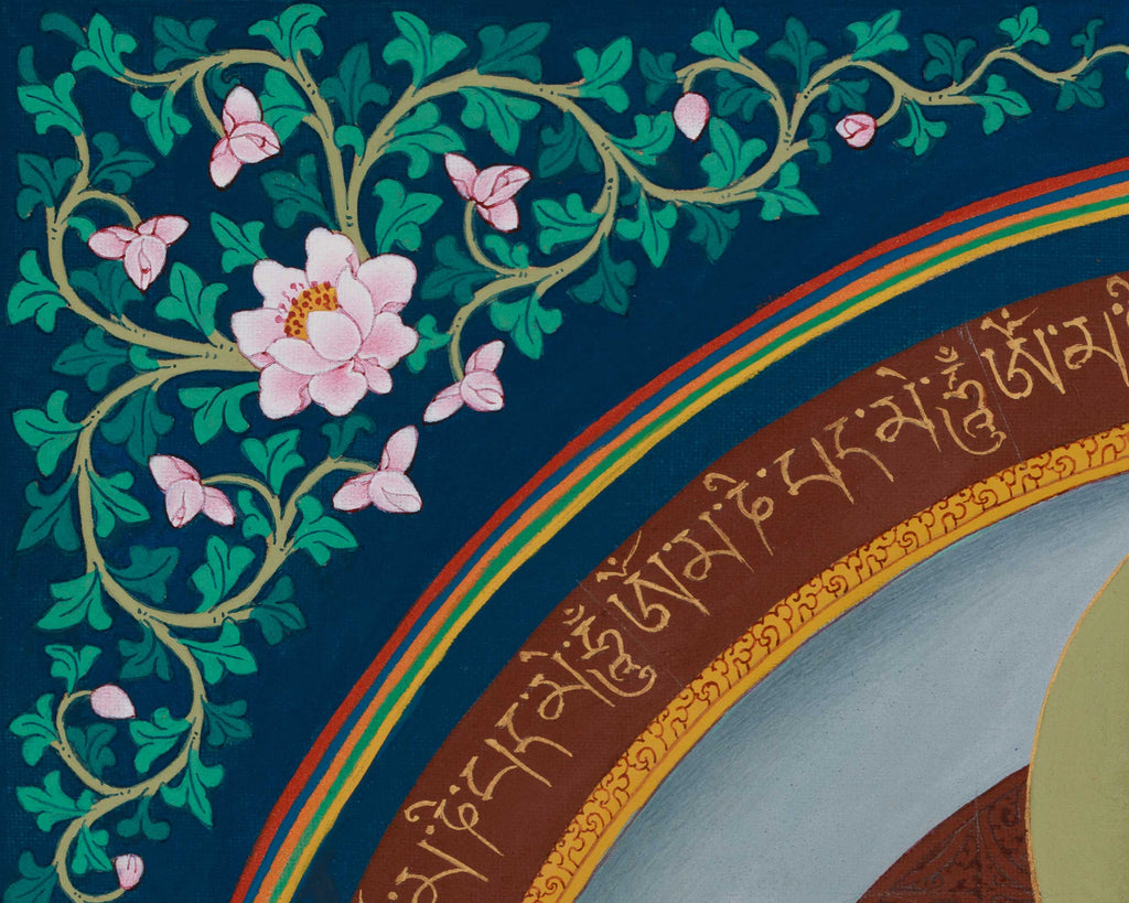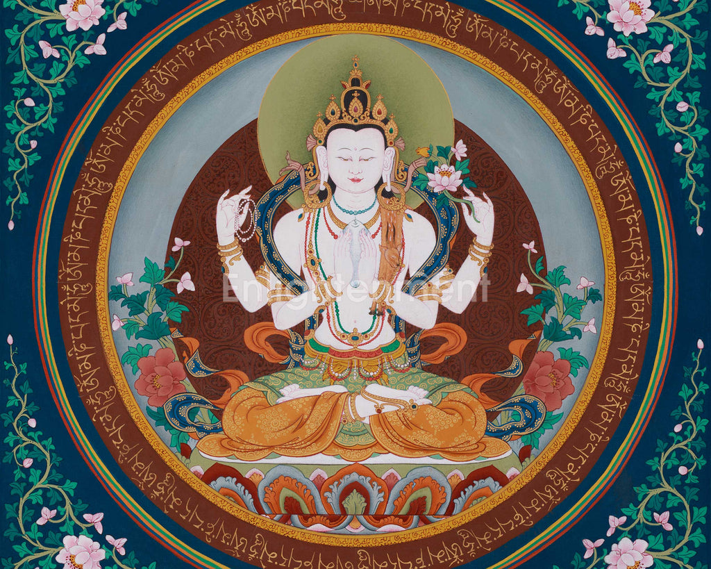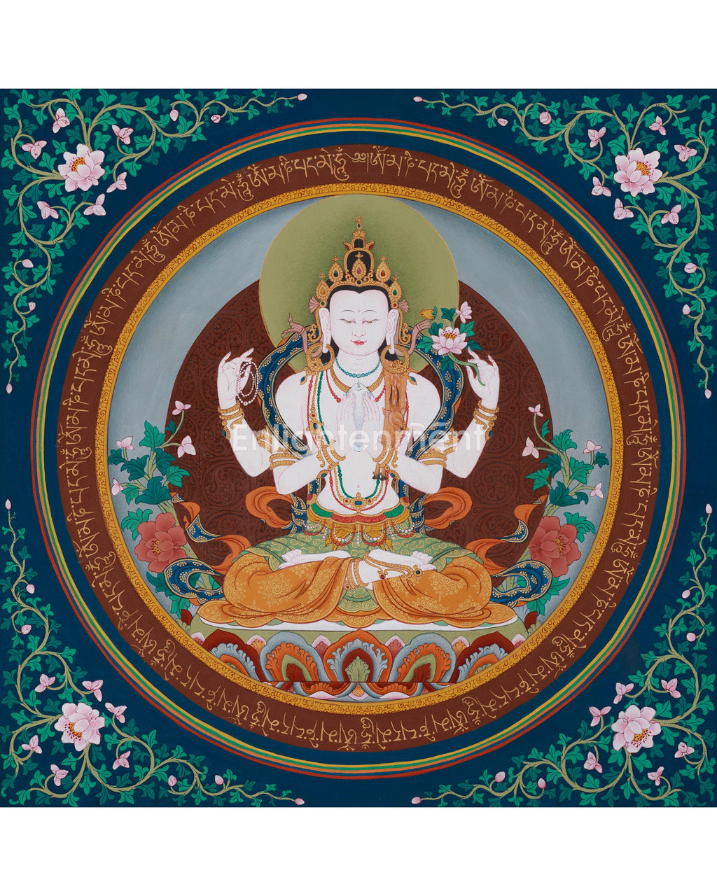 Avalokiteshvara, known as Chenrezig in Tibetan Buddhism, is venerated as the Bodhisattva of Compassion, diligently endeavoring to alleviate suffering and guide all sentient beings. Depicted with four arms, each grasping a symbol of compassion and wisdom, he exemplifies the boundless mercy that permeates the universe. In this Four-Armed Avalokiteshvara Mandala, Chenrezig is seated serenely, encircled by an exquisite Mandala of lotus flowers and sacred mantras that symbolize his healing powers. This thangka functions not only as a visually captivating artifact but also as a spiritual instrument for invoking Avalokiteshvara’s divine blessings of peace, protection, and healing. Place this sacred Mandala within your environment and invoke the transformative power of compassion into your life.