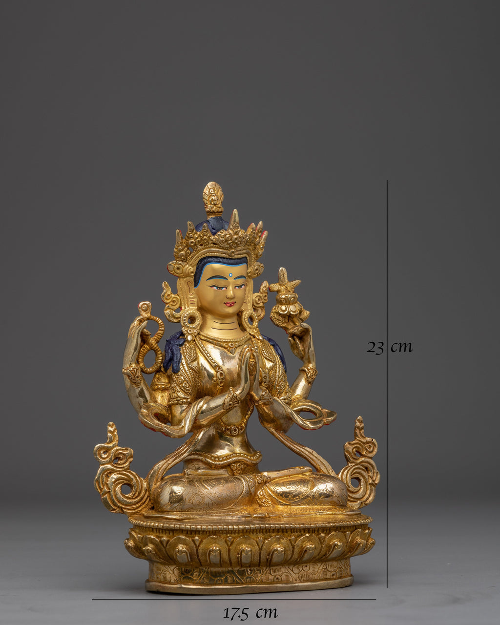 This Four-Armed Chenresig Compassion Sculpture, often regarded as the embodiment of boundless compassion, embodies love, peace, and a desire to alleviate the suffering of all beings. This handcrafted statue is 9.1" (Height) x 6.9" (Base) and weighs 1.69 kg. It is made of copper, adorned with 24K gold gilding, and enhanced with detailed gold and acrylic paints. This sculpture, created by expert Nepalese artisans, symbolizes the spiritual traditions of Himalayan Buddhism and makes a meaningful addition to altars, meditation places, or sacred collections.