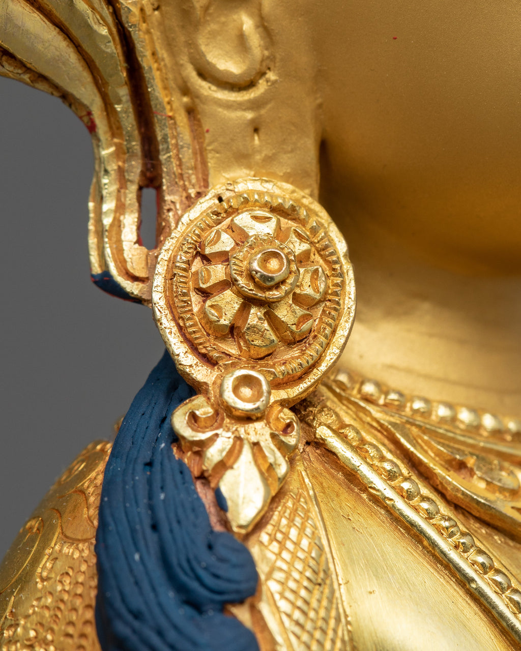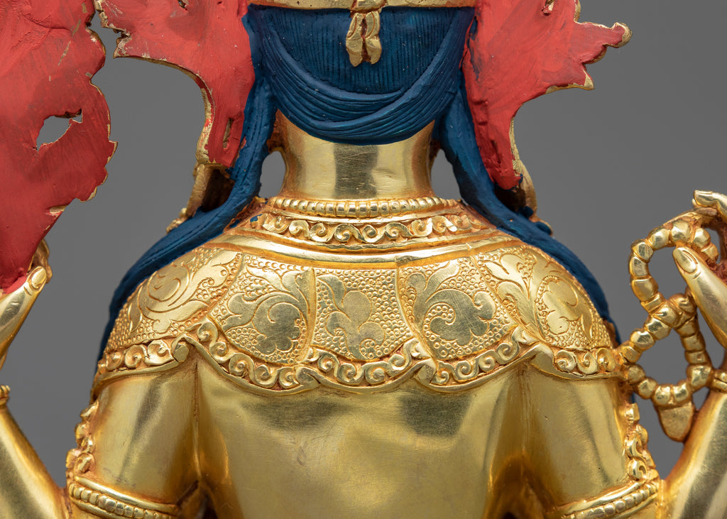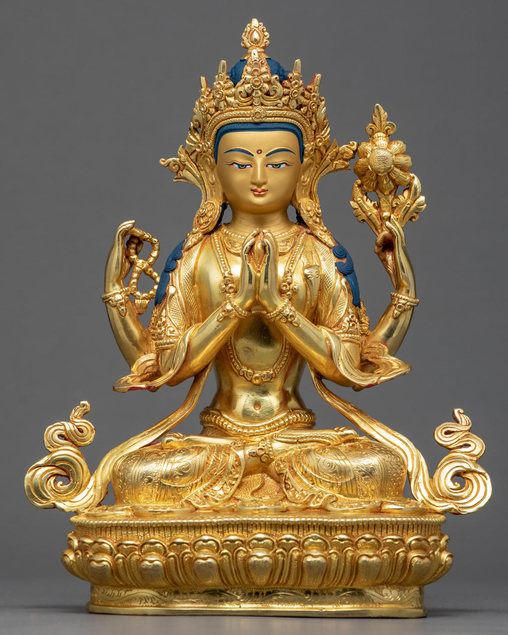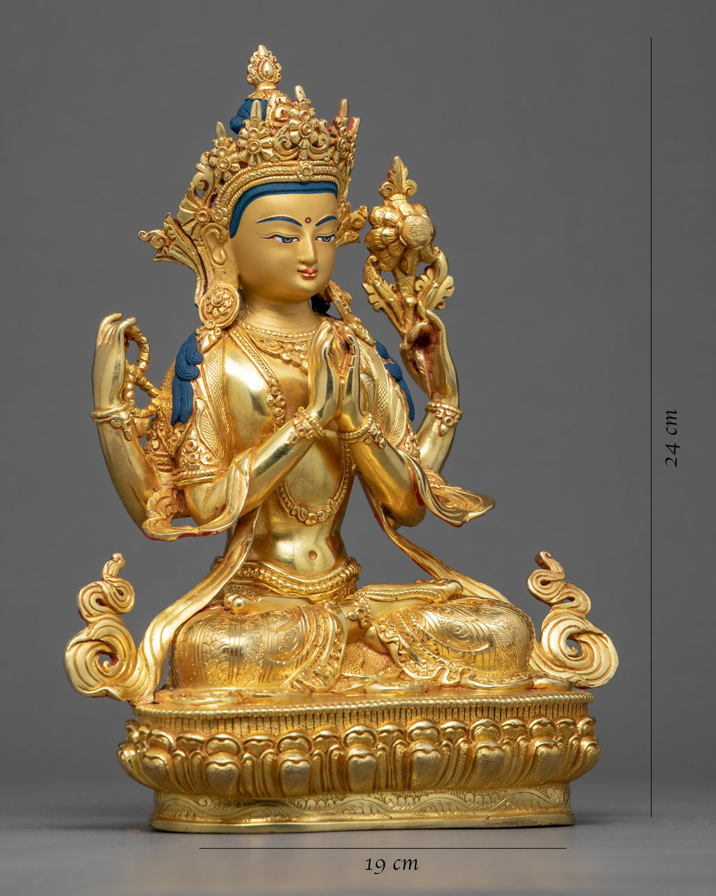 We have exquisitely hand-carved the sculpture of Four-Armed Chenrezig in traditional Himalayan art of Nepal. In this Tibetan statue, we have portrayed Avalokiteshvara seated on top of a moon disc lotus seat with a tranquil expression. We have sculptured him holding a crystal rosary in his upper-right hand while a lotus in his upper left. Similarly, we have depicted him holding a wish-fulfilling jewel with his lower hand. You can use this Buddhist figurine in different auspicious Vajrayana practices and in your regular meditational activities. It took more than a month for us to carve the artwork since we have meticulously designed and deft the crown, ornaments, robe, lotus, and other essentials using 24k gold, crafted in pure copper.