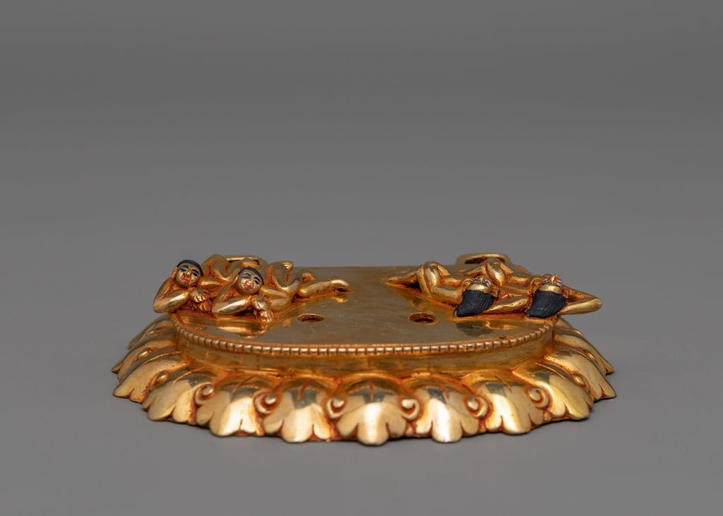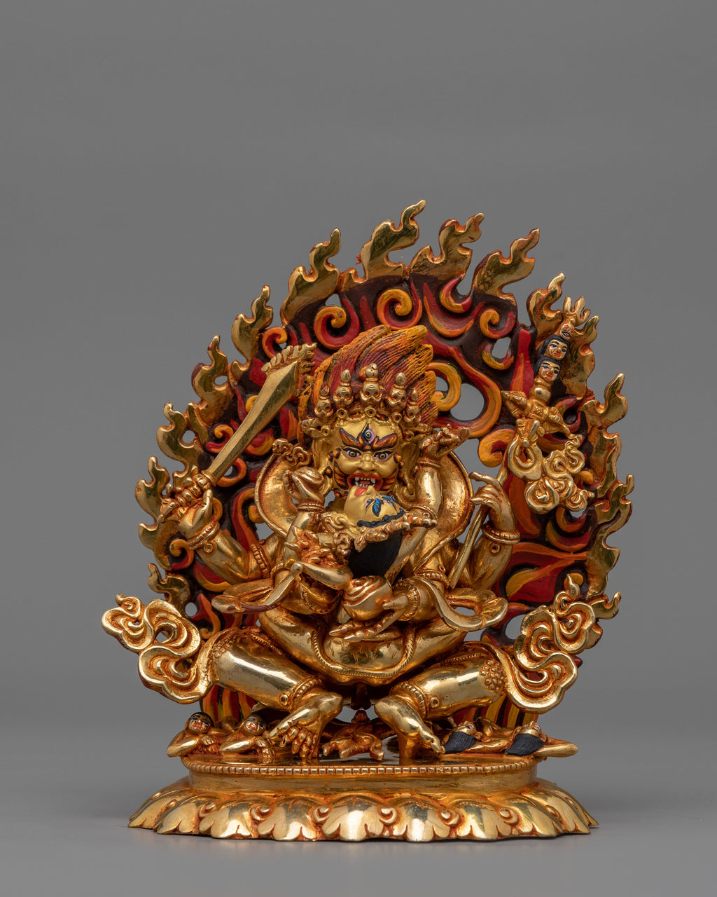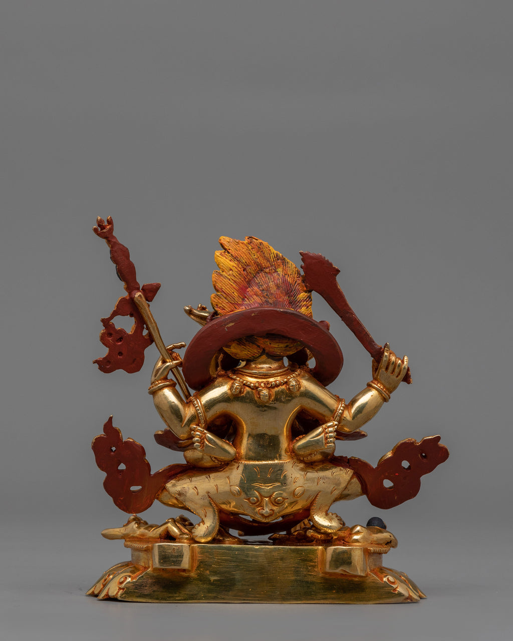 This Four Armed Mahakala Mantra Statue is a representation of the revered Buddhist guardian deity. Sculpted from a copper body and adorned with 24K gold gilding, this masterpiece is further enhanced with intricate gold and acrylic paintings, bringing out the deity’s fierce yet compassionate expression. Measuring 6.7” in height and 5.5” at the base, this statue is the perfect addition to your shrine, meditation space, or sacred altar.