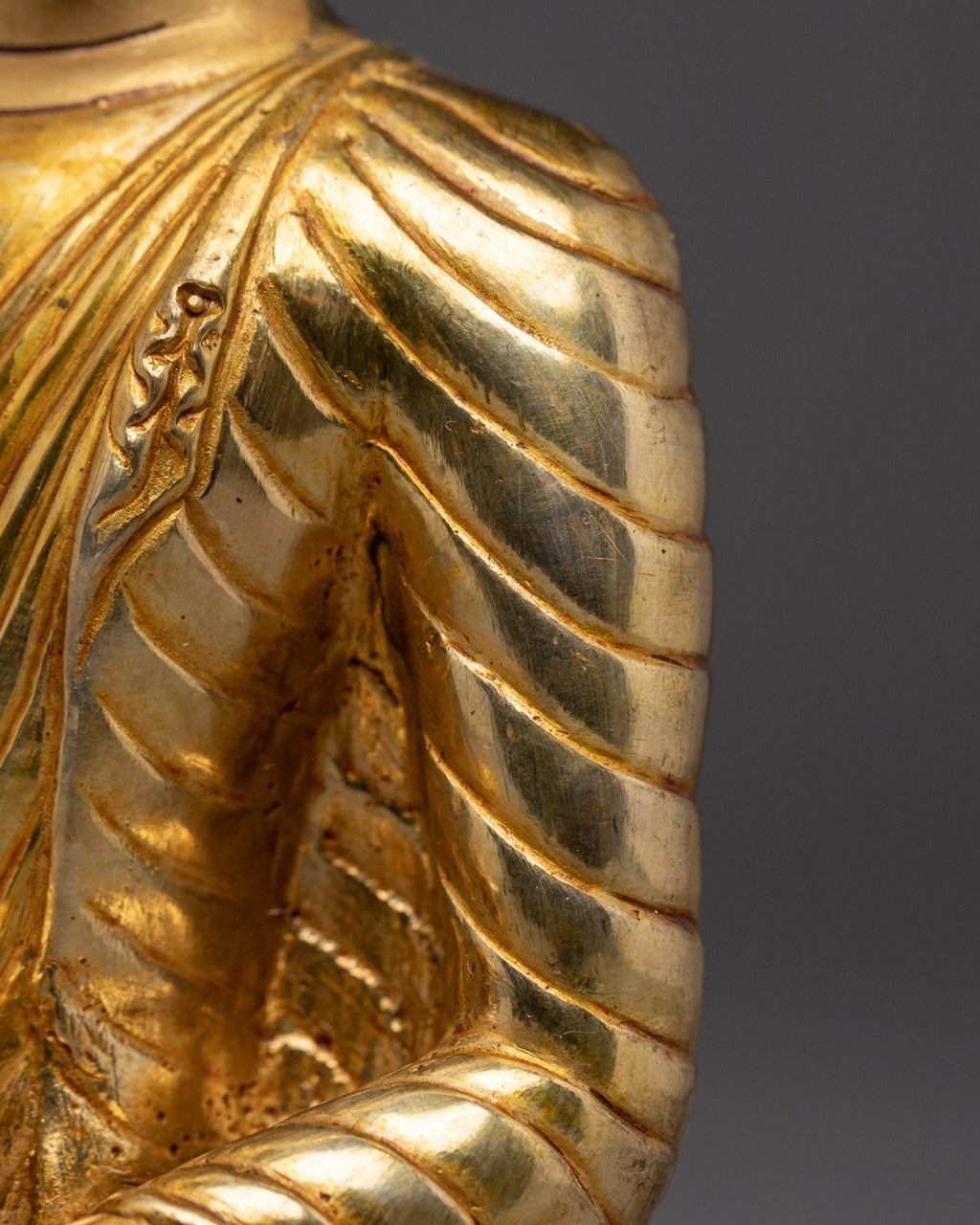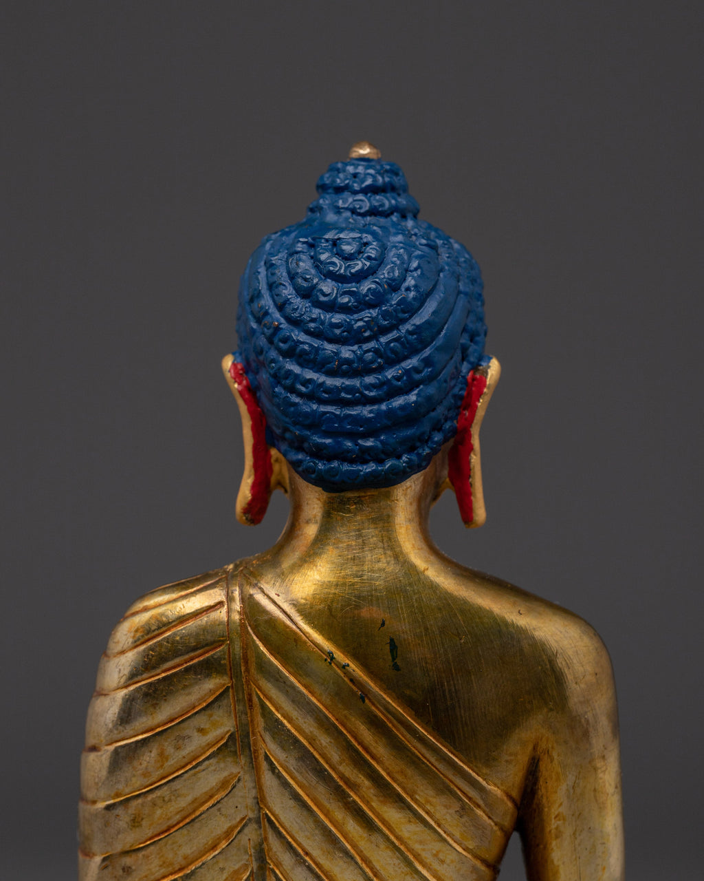The Four Noble Truths of Shakyamuni Buddha statue stands 5.9 inches (15 cm) tall with a base measuring 4.1 inches (10.5 cm), and weighs a lightweight 0.43 kilograms. Crafted from a copper body, it is finished with gold electroplating and detailed with gold and acrylic paintings, adding a radiant and refined touch. Combining traditional craftsmanship with exquisite detail, this Shakyamuni Buddha sculpture brings timeless inspiration and peaceful presence into any space.